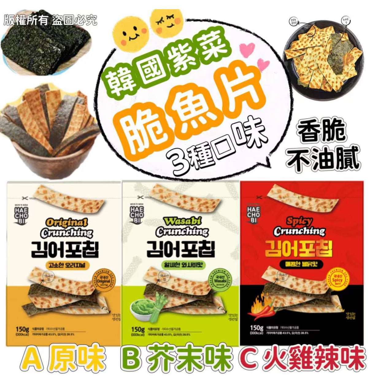 韓國直送 全新上市 韓國制紫菜脆魚片 (原味/芥末味/火雞🌶辣味) 150G