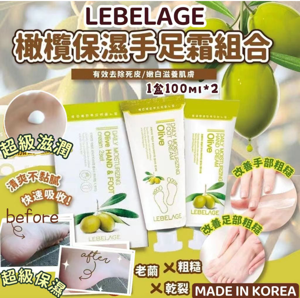 韓國 LEBELAGE~橄欖保濕手足霜組合套装 1套2盒。共4支
