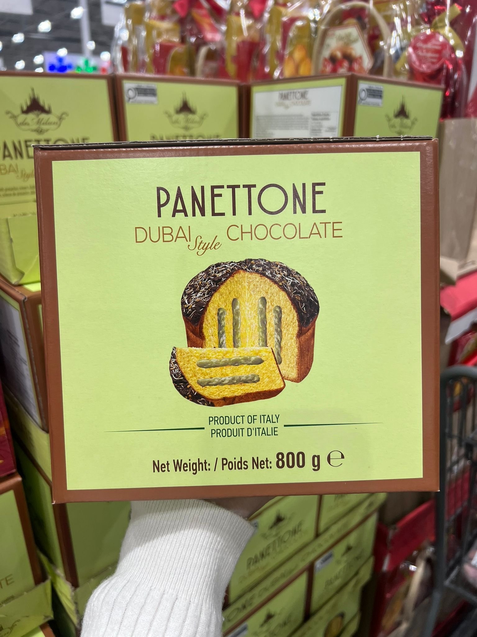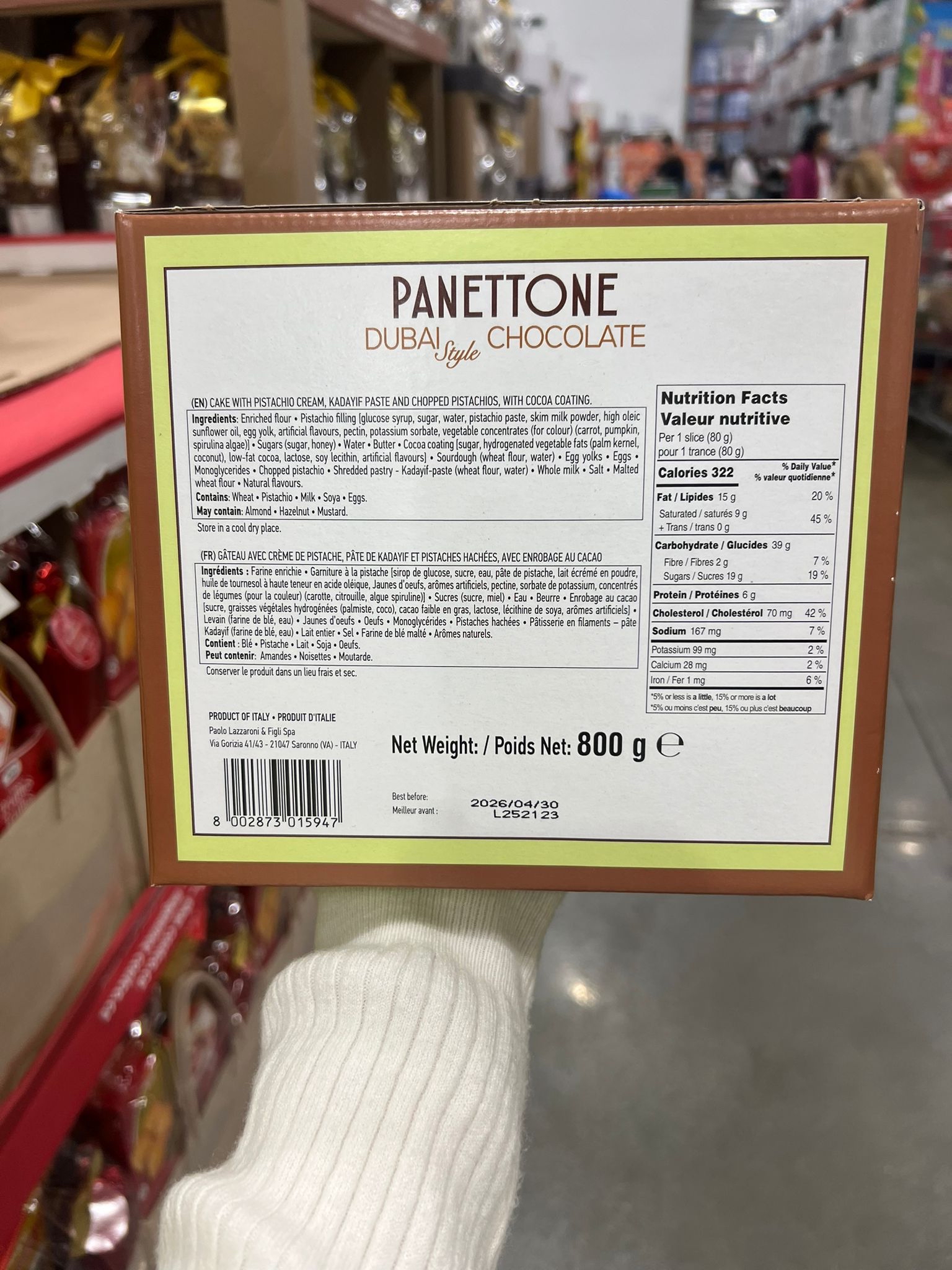 加拿大直送 杜拜風味巧克力Panettone Panettone Dubai Style Chocolate *✨Panettone Dubai style chocolate cake 800g* 重點推介‼️‼️ 🇮🇹義大利製造、 滿滿義式甜品的高級感 ⭐️差不多兩磅的巨蛋糕 ⭐️2025 新的節日限定款、 濃厚cocoa、 內有開心果醬、 蛋糕似海綿 💖 甜但不太甜、必試! * 這是一款義大利製造的潘尼朵尼蛋糕,內含開心果奶油內餡,外層裹上杜拜風味的巧克力和卡達伊夫(kataifi)麵團。 * 它是一種現代版的節慶經典點心,沒有傳統潘尼朵尼中的葡萄乾或蜜餞果皮。 * 淨重為800 克。 * 📆食用日期:04/2026
