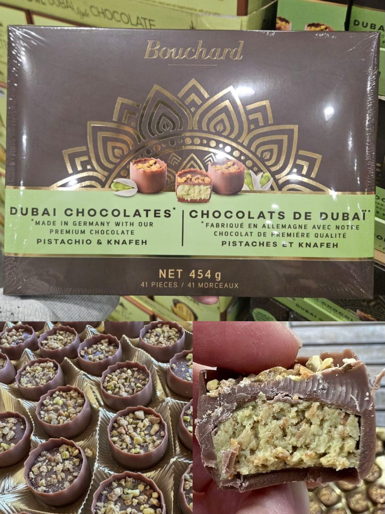 Bouchard 杜拜開心果朱古力 (454g - 41 粒) 傳承自1931 年Bouchard 朱古力品牌,於德國🇩🇪精製而成 極度推介😍 ❇️濃郁的優質朱古力外殼包裹住絲滑既開心果cream + 極度酥脆的傳統中東Knafeh~ ❇️一啖咬落去,層次豐富、料十足!
