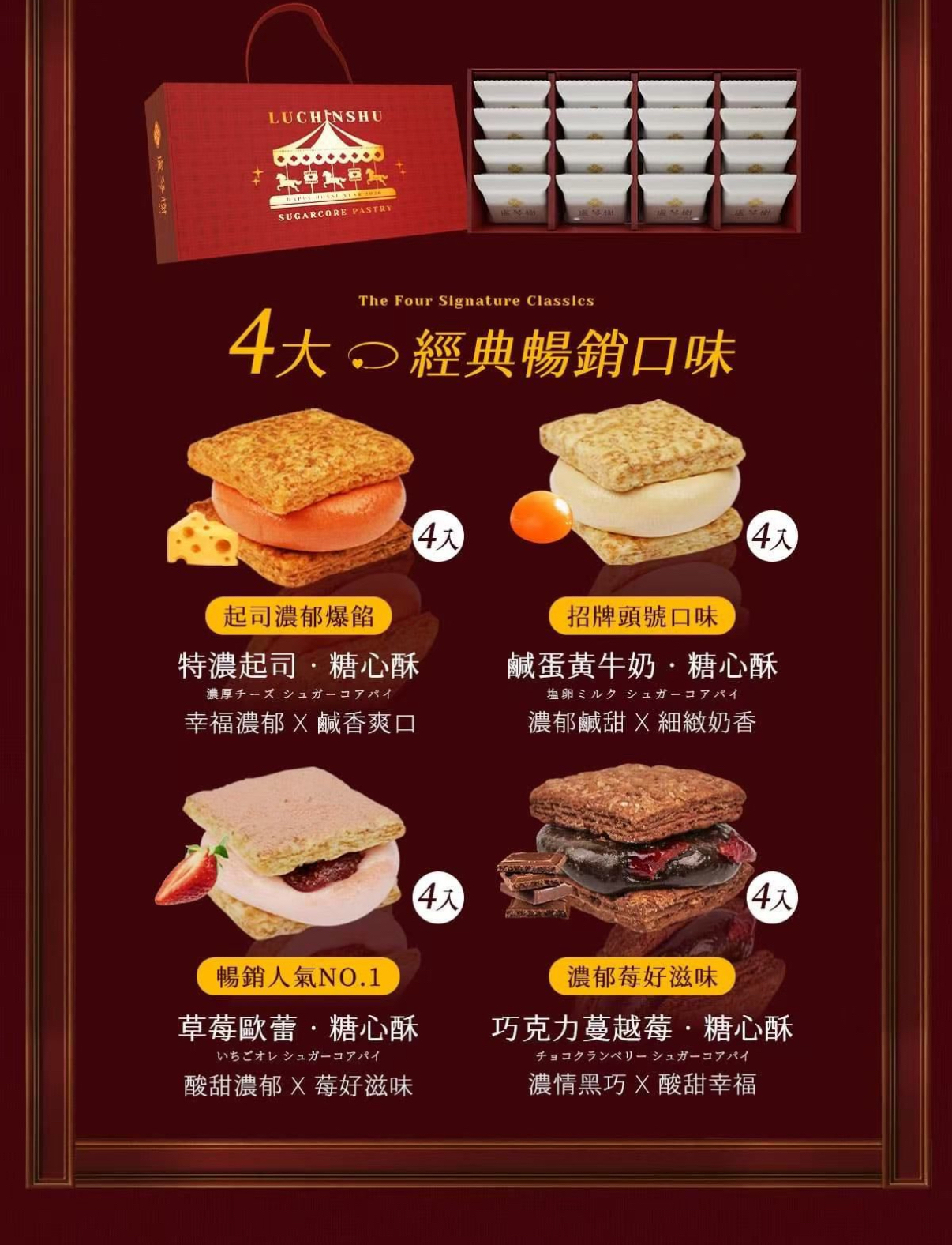 台灣盧琴樹 2026新年禮盒 🎁 盧琴樹-金馬轉心*好酥喜禮盒(效期90日) 規格:16入/盒 內容:草莓歐蕾*4、特濃起司*4、鹹蛋黃牛奶*4、巧克力蔓越莓*4 (一箱:10盒) 📦箱批$130 ⭕️散批$125 📆16/1截 📆1/2到