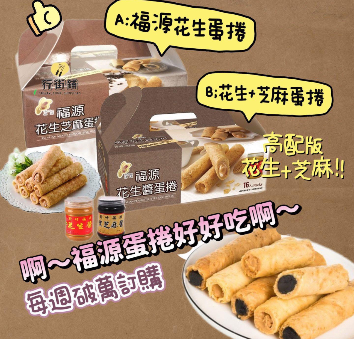 台灣直送 【福源】超人氣蛋捲系列 🔗歡迎網站落單 說到花生醬,非「新竹福源」莫屬啦! 新鮮天然原料製作的花生醬、芝麻醬 每每推出都造成轟動! 福源花生蛋捲禮盒(16入) 鍾意花生嘅,你一定唔好錯過 福源花生芝麻蛋捲禮盒(16入) 一次吃到兩種口味蛋捲 花生控、黑芝麻控的福音 香濃滋味令你愛不釋手! ✔超過60年老字號花生醬品牌 ✔無添加防腐劑、化學添加物 ✔堅持手工製造,不含一滴水 🔽🔽🔽 ✅品名:福源花生醬蛋捲(16入) ✅內容物:花生*16 ✅規格:320g ✅葷素:蛋素 ✅保存期限:8個月 ✅箱入數:30盒/箱 ✅過敏原:本產品含有花生製品、麩質的穀類、蛋,不適合其過敏體質者食用(該生產線亦生產芝麻製品) ✅品名:福源花生芝麻蛋捲禮盒(16入) ✅內容物:混合花生*8/芝麻*8 ✅規格:320g ✅葷素:蛋素 ✅保存期限:8個月 ✅箱入數:30盒/箱 ✅過敏原:本產品含有花生、芝麻製品、麩質的穀類、蛋,不適合其過敏體質者食用 🔽🔽🔽 ✅產地:台灣 📅11月29號結單📆 12月中到港 ⭕️1箱30盒 ⭕️箱出$110 ⭕️散出$105 ⭕️MOQ6