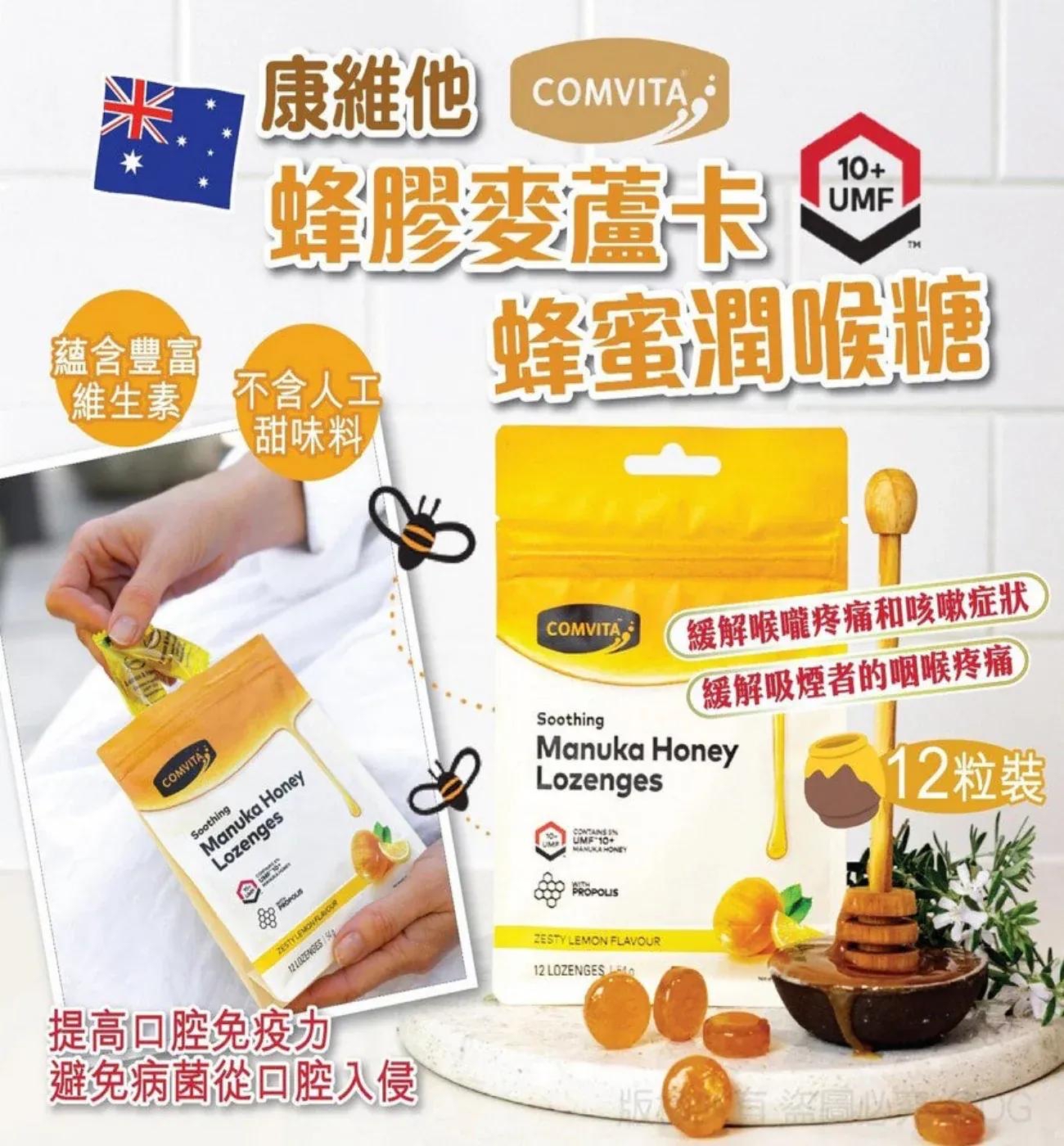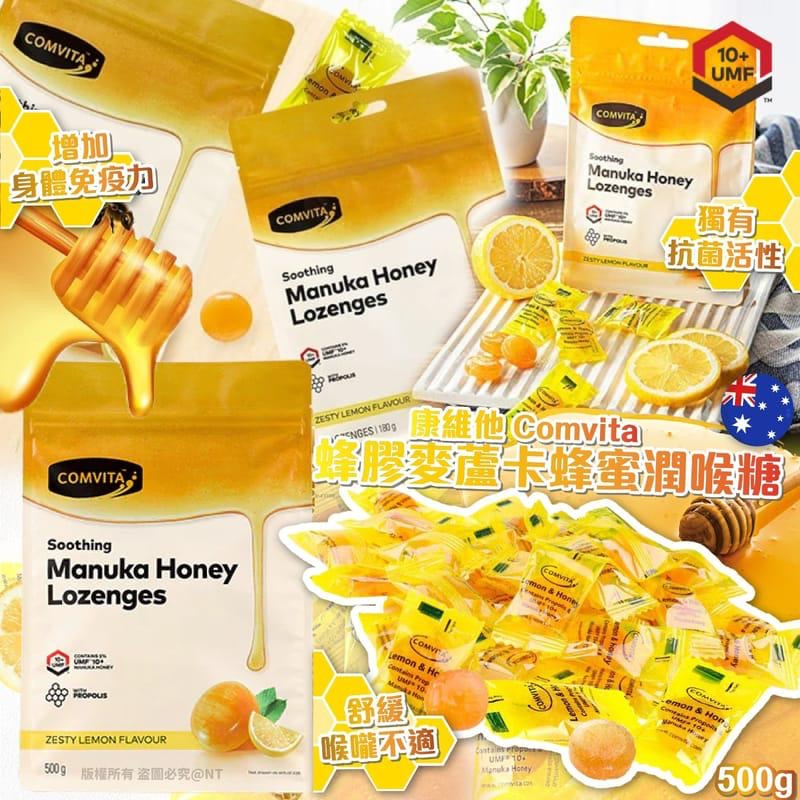 康維他 Comvita 蜂膠麥蘆卡蜂蜜潤喉糖 500g 哇❗超級勁抵買😍 康維他Comvita 蜂膠麥蘆卡蜂蜜潤喉糖💕 一粒糖🍬= 90毫克🐝蜂膠,非常珍貴😘 📌適用於: 煙酒過多人士、扁桃、體炎症以及感冒咳嗽😷 10+麥盧卡蜂蜜糖潤喉糖檸檬味🐝 絕非一般既蔗糖,係一款純正既蜂蜜糖🍯 成份中既10+麥蘆卡蜂蜜榮獲世界認可其獨有的抗菌活性🏆 有抗菌💫消炎既特性💦可以溫和滋潤並舒緩各種喉嚨不適✨ 仲可以幫助增加身體免疫力💪所以並唔係普通既喉糖❗👍🏻 添加左可以增強抵抗力&殺菌既蜂膠, 對抗各種口腔以及上呼吸道感染的問題、喉嚨疼痛只需2粒❗ 🍯提高口腔免疫力💪 🍯蘊含豐富的維生素👍 🍯避免病菌從口腔入侵🎉 🍯緩解吸煙者的咽喉疼痛🍀 🍯不含人工甜味料、防腐劑😋 🍯能緩解喉嚨疼痛和咳嗽症狀✨ -規格 : 500g (1包約100-110粒左右) -產地 : 紐西蘭 -到期日 : 2027年11月後 📆24/11。12pm截 📆12月中到