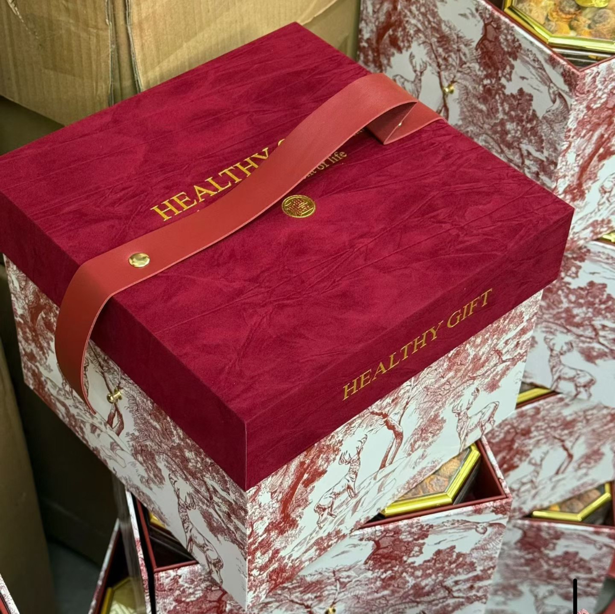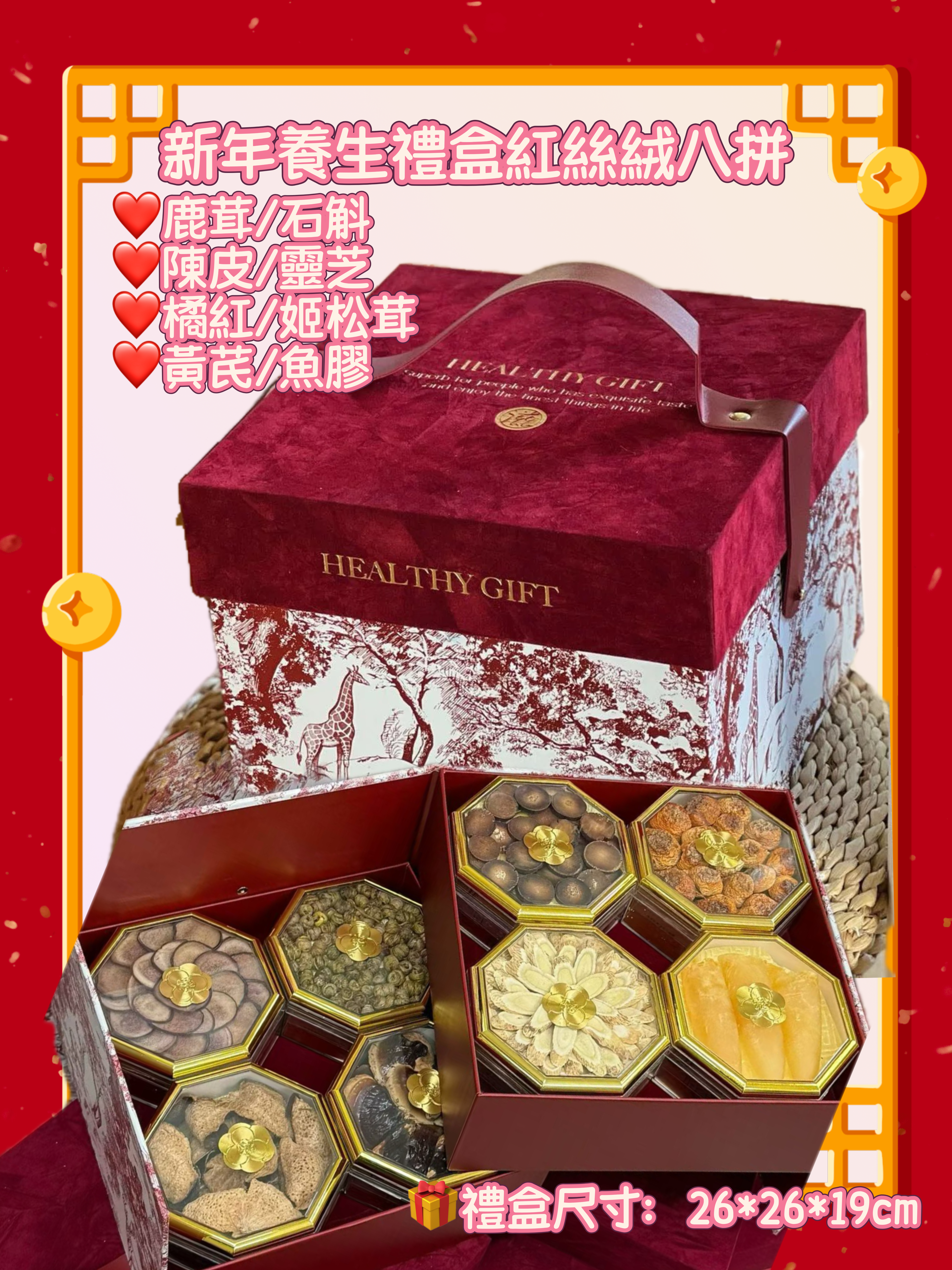 新年養生禮盒 紅絲絨八拼平價版~ 非常豐盛嘅一個養生禮盒總共有八樣產品 意頭非常之好,寓意大家都發♥️ 無論係送俾人或者收到嘅都非常之好意頭♥️ ❤️鹿茸50克 💜石斛50克 ❤️陳皮30克 💜靈芝30克 ❤️橘紅50克 💜姬松茸30克 ❤️黃芪50克 💜魚膠3條 🎁禮盒尺寸:26*26*19cm 📆截1月22 3pm 📆2月上初 💰批$250