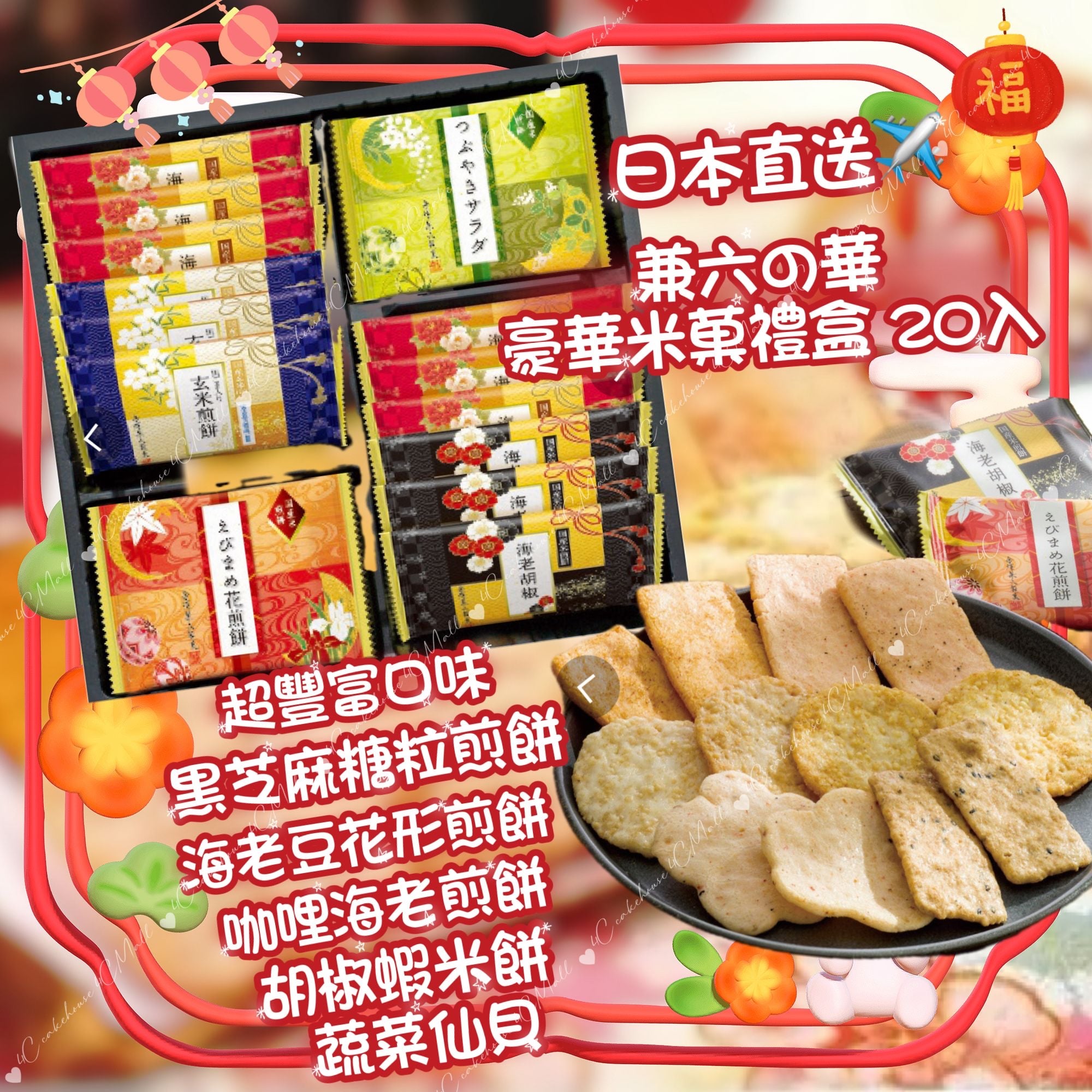 日本直送新年團🧧 金澤兼六製菓】兼六の華 豪華米菓禮盒 20入/盒 🔗歡迎網站落單 金澤兼六製菓以其精緻的手工技藝和高品質的原材料,聞名於日本和世界各地。「兼六之花」是金澤兼六製菓所生產的100%國產米製成的米菓,融合了傳統和現代製菓技術,帶來絕佳的味覺享受。 呢個非常之大合送禮唔失禮 ✨超豐富口味✨ 💖黑芝麻糖粒煎餅*3 💖咖哩海老煎餅*6 💖胡椒蝦米餅*3 💖海老豆花形煎餅*4 💖蔬菜仙貝*4 🍘共20包 內容量:336g/盒 商品特色 包裝華麗、色彩豐富,拿來作為禮物送人也超級適合! 口味眾多,不僅吃不膩,更讓你一口接著一口停不下來😍 商品詳情 商品規格 產品尺寸:25.0cmx25.0cmx4.5cm ■儲存方法:常溫 ■規格補充:從製造日起常溫約120天 📆30/12截 📆1月中之後到 📦箱入15盒 💰$57@1 📦箱出$52