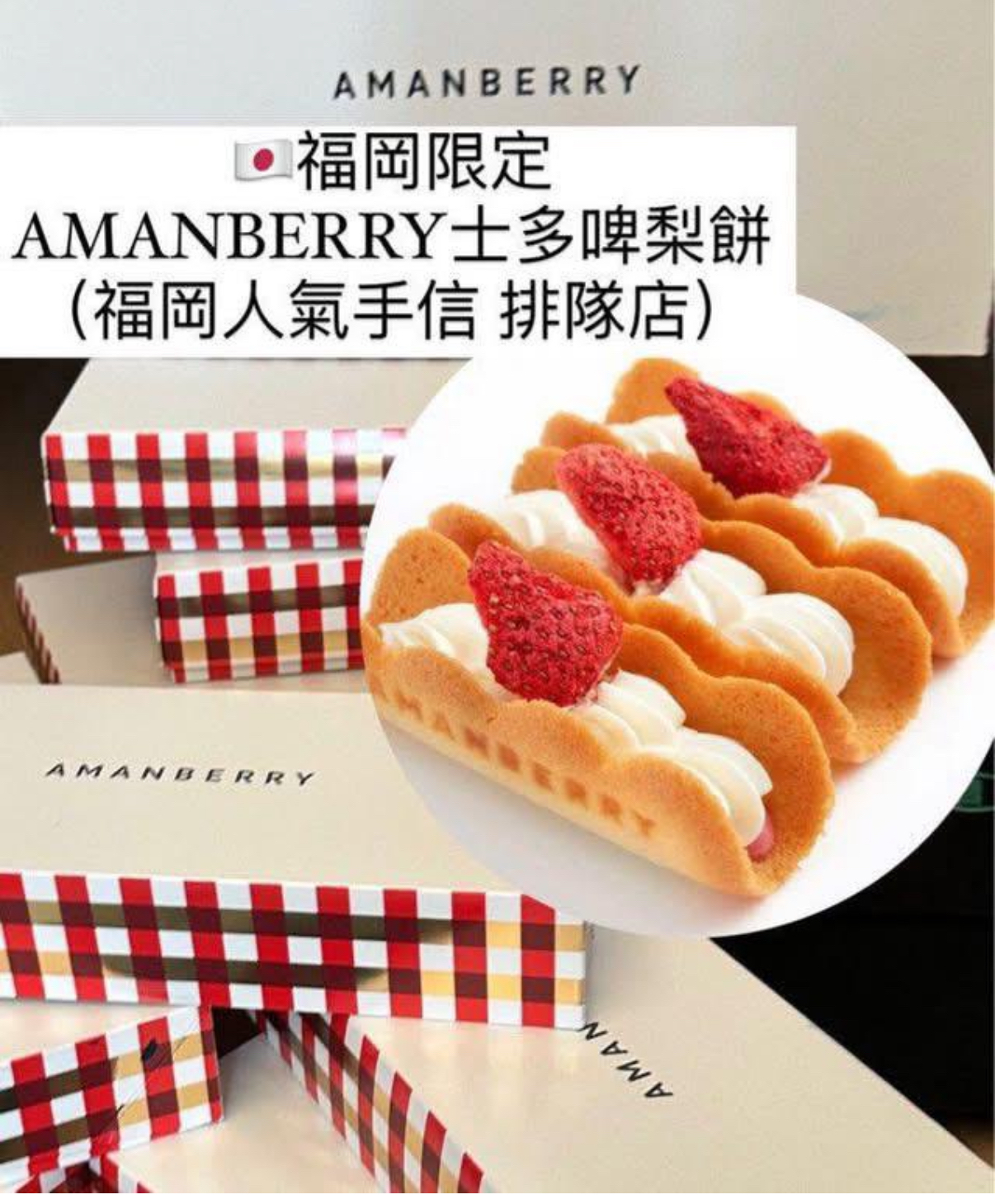 日本直送🇯🇵 🎄聖誕團🎄 🇯🇵最難買的福岡手信 - AMANBERRY🇯🇵 🇯🇵AMANBERRY福岡甘王草莓奶油薄脆🍓 士多啤梨粉絲注意⚠️ 新推出既AMANBERRY,被稱為比NY更難買既美食,日本全國只有一間分店,福岡限定! 因為佢每日開店前百貨公司門外都會有一條長長龍,一開門就直衝去AMANBERRY排隊,可見受歡迎程度😱保持新鮮品質,每日限量發售🛍️ ⚠️我地親自提早排隊代購,由於此店由排隊到購入需至少一小時,當日貨量售完即止‼️有興趣既朋友記得預早落單(恕不能臨時加單🙏🏼) 相片為平日中午已經完售⋯(小編表示好羨慕店員🥲每日中午就完成任務) AMANBERRY簡介: ▶️產品必須使用嚴選的甘王🍓製作。甘王是福岡縣引以為傲的草莓品種。將甘王製成點心最重要的是充分發揮甘王所有口味的潛力。 ▶️甘王本身的美味可以與其他糕點原料結合,創造出更協同效果的美味。為此,我們尋找最適合甘王的點心原料是原始質地的巧克力。🍫生巧克力的濃鬱奶油味襯托出甘王的甜味和香氣,進一步提升了甜點的美味。 ▶️引進新型糖果製造技術 為了甘王和生巧克力,我們安裝了一個特殊的烤箱,可以從上方和下方加熱包裹兩種成分的薄紗,從而產生更美味和濃厚的味道。 五感享受的“甘王🍓×原味巧克力🍫” 「AMANBERRY」以品牌名稱命名,誕生於三項承諾,是一種類似脆餅的甜點,由輕烤的薄紗製成,上面舖有牛奶奶油和甜草莓。 出產地:日本 賞味期限:約一個月 保存方式:常溫或冷藏(0~-4度) 甘王草莓奶油薄脆: 1️⃣8入禮盒裝 2️⃣12入禮盒裝 3️⃣15入禮盒裝 ———————————— 📣所有食品不設現貨(所以不會為清貨而比舊貨!) 接單後發貨前才購入🚀保證新鮮😋 日本直送到港🛫價錢已包到港國際運費📦 💁🏻♀️小本經營直接代購,100%全新及正貨,訂單成立後不設退款或更改,如遇缺貨全數退款 📃所有貨品版權及商標由品牌持有人擁有,圖片只作分享用途 1️⃣8入禮盒裝$121 2️⃣12入禮盒裝$170 3️⃣15入禮盒裝$206 📆30/11截11 am 📆12月中到