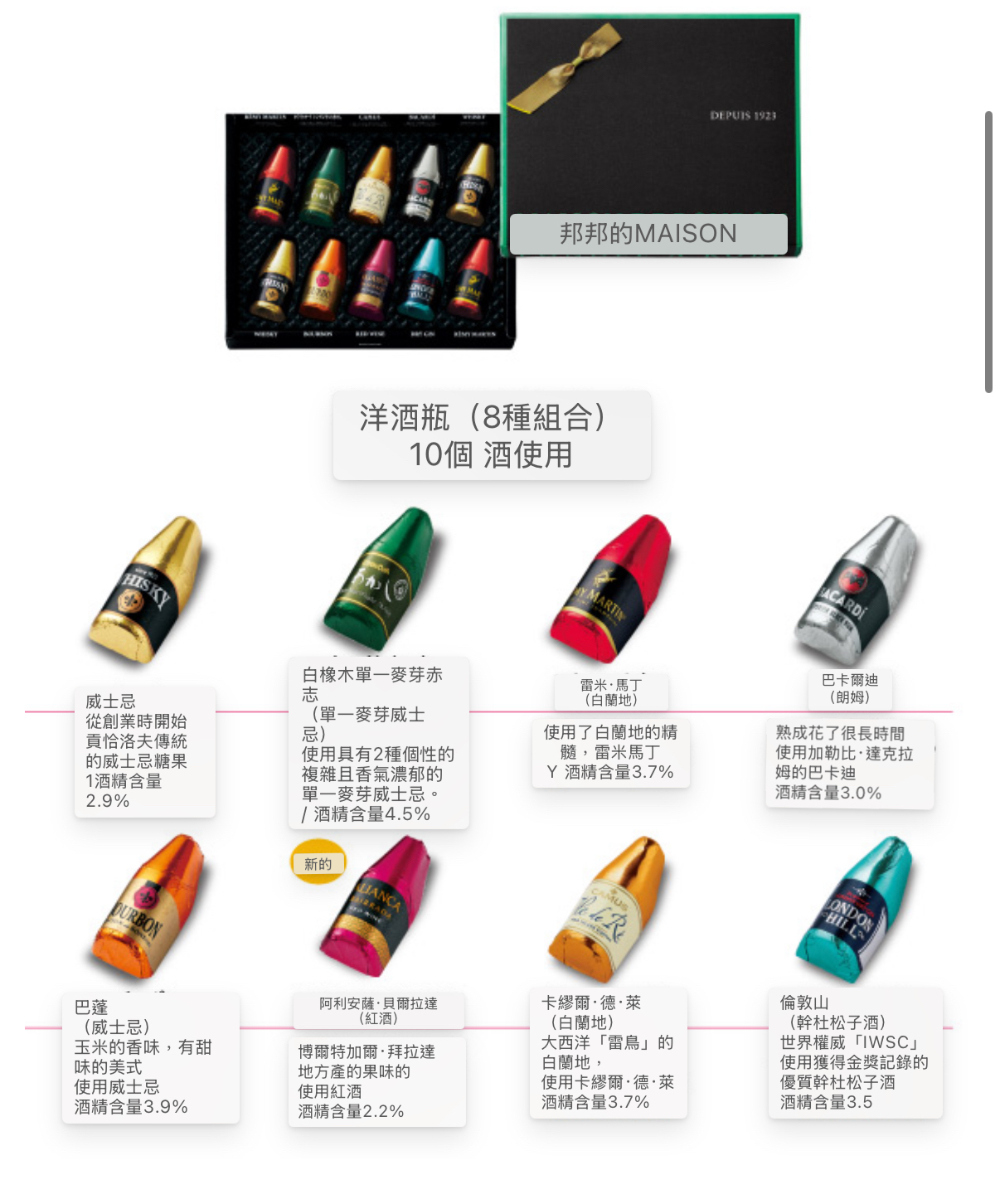 日本直送 【預訂】【情人節/新年限定】 MAISON DE BONBON - 洋酒酒心朱古力10件裝 10個款式 威士忌Whiskey 明石白橡木單一麥芽威士忌 White Oak Akashi Whiskey 波本威士忌Bourbon Whiskey 人頭馬Rémy Martin 百加得BACARDÍ rum ALIANÇA BAIRRADA 紅酒 卡慕雷島XO干邑白蘭地 必富達倫敦干金酒 商品について 商品サイズ(縦×横×高さ):145×180×29(mm) 仕様:紙箱 賞味期限:製造日より5ヶ月(最長で2026.05.31) 特定原材料等28品目:乳成分・アーモンド・大豆 お酒を使用しています。 📆10/1截 📆1月尾左右到 💰115 💰10以上$110