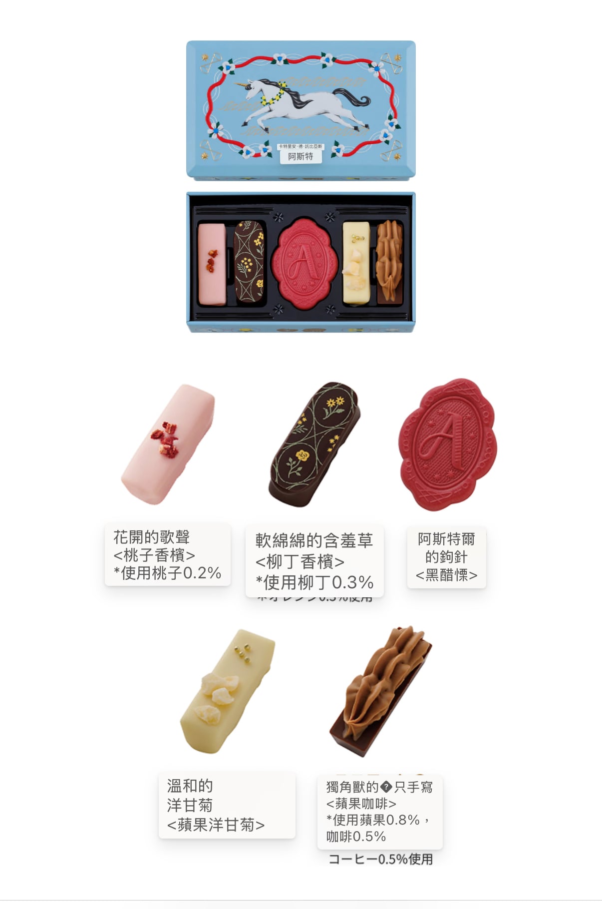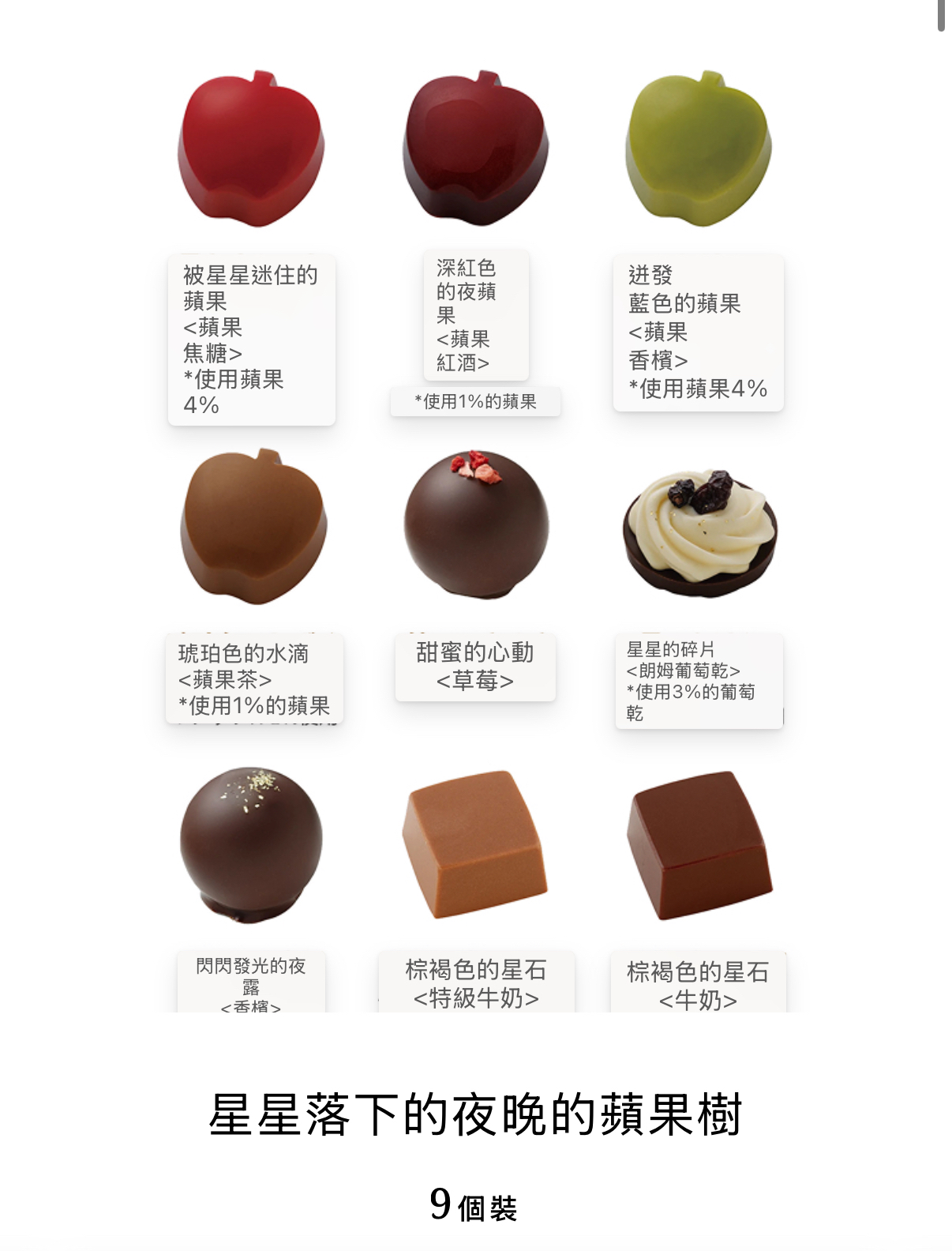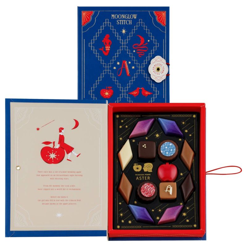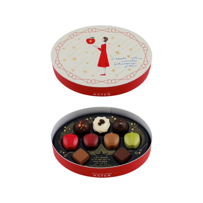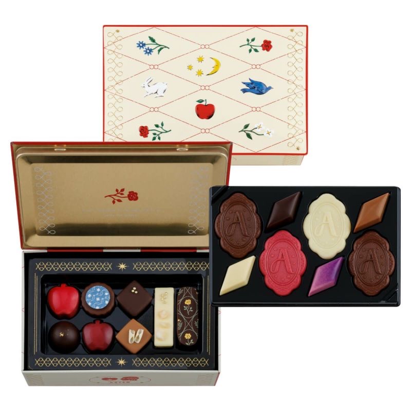 日本直送 日本 MOROZOFF X ASTER 日本最新品牌 紅色果實,甜蜜的魔法。 愛上蘋果的女孩。 出現在100年一次的星星落下的夜晚 只有一個閃閃發光的蘋果。 從咬一口的時候開始阿斯特爾的世界是, 就像被施了魔法一樣。 星星落下的夜晚的蘋果樹 流星下的蘋果樹阿斯特爾從小就 熟悉的大蘋果樹。從那裡看到的滿天的流星和 戴著星星閃閃發光的不可思議的蘋果。 被甜蜜的心動包裹著的特別夜晚的記憶。 A/星星下的蘋果樹橢圓形禮盒 顏色鮮豔的蘋果分別是帶星星的蘋果(蘋果焦糖)、深紅色的夜蘋果(蘋果酒)、琥珀色的水滴(蘋果茶)、迸發的藍色蘋果(蘋果香檳)的味道。 除此之外,還可以品嚐到甜美的心動(草莓)、閃閃發光的夜露(香檳)、星星的碎片(朗姆葡萄乾)、棕褐色的星石(特加牛奶、牛奶)的味道。 保質期 2026年4月30日 重量 140g 外觀尺寸 116mm×166mm×40mm B/可愛蘋果型朱古力小禮盒 豔麗的蘋果型巧克力分別是星星的蘋果(蘋果焦糖)、深紅色的夜蘋果(蘋果酒)、迸發的藍色蘋果(蘋果香檳)的味道。 保質期 2026年4月30日 重量 95g 大小 袋子尺寸 80mm×180mm×220mm 罐子尺寸:76mm×76mm×71mm C/獨角獸餅乾小禮盒 阿斯特爾的鉤針(黑醋餅)、花開的歌聲(桃子香檳)、蓬鬆的含羞草(橙色香檳)、溫和的洋甘菊(蘋果洋甘菊)、獨角獸的鬻(蘋果咖啡)的味道 可以享受。 保質期 2026年4月30日 重量 150g 大小 外觀尺寸 86mm×140mm×37mm E/星星的縫線禮盒 裝有書型包裝的巧克力拼盤。 刺繡中融入了阿斯特爾激動的各種事件。 圍繞著它們的是,阿斯特爾居住的星星傳到美麗的國家「星星的縫線」。 讓人聯想到滿天繁星的夜空,是阿斯特爾最喜歡的圖案。 表現了阿斯特爾的心動,披著星星的蘋果(蘋果焦糖)、人魚的眼淚(焦糖醬)、月光的絲帶(大馬爾涅)、雙胞胎的羽毛(草莓奶油)、妖精的髮飾(接骨木花) 的味道。 然後可以享受到以星星縫線為形象的巧克力(熱葡萄酒、香草酒、卡爾瓦多斯、香草、白葡萄酒的味道)。 13個裝 保質期 2026年4月30日 重量 205g 外觀尺寸 188mm×133mm×36mm F/高貴雜錦朱古力禮盒 上層放著阿斯特爾編織的鉤針裝飾(牛奶、白、黑醋酸)和表現了阿斯特爾國家流傳的「星星縫線」的巧克力(熱葡萄酒、卡爾瓦多斯、香草、白)。 在下層,將星星的蘋果(蘋果焦糖)和妖精的髮飾(接骨木花)、溫和的洋甘菊(蘋果洋甘菊)等味道組合在一起。 16個裝(2層裝) 保質期 2026年4月30日 重量 335g 大小 外觀尺寸 105mm×160mm×68mm 📆12/1截12pm 📆5/2到 💰批 A 💰102 💰10以上97 B 💰 74 💰10以上69 C 💰85 💰10以上80 D 💰142 💰10以上137 E 💰200 💰10以上195