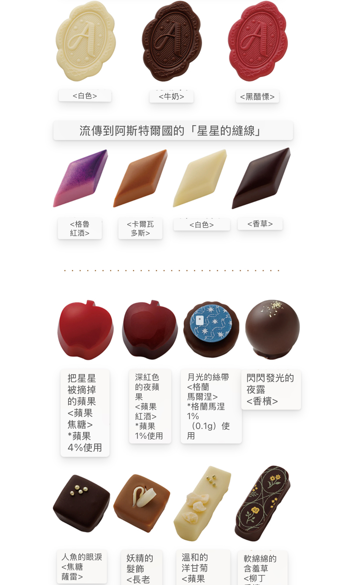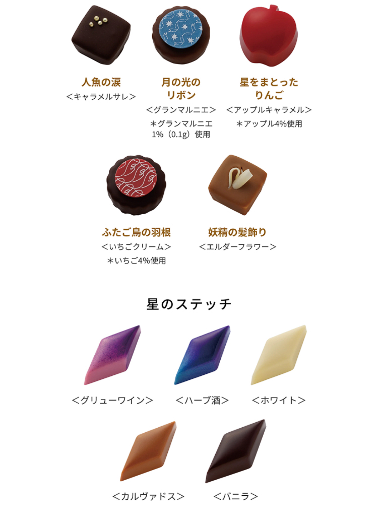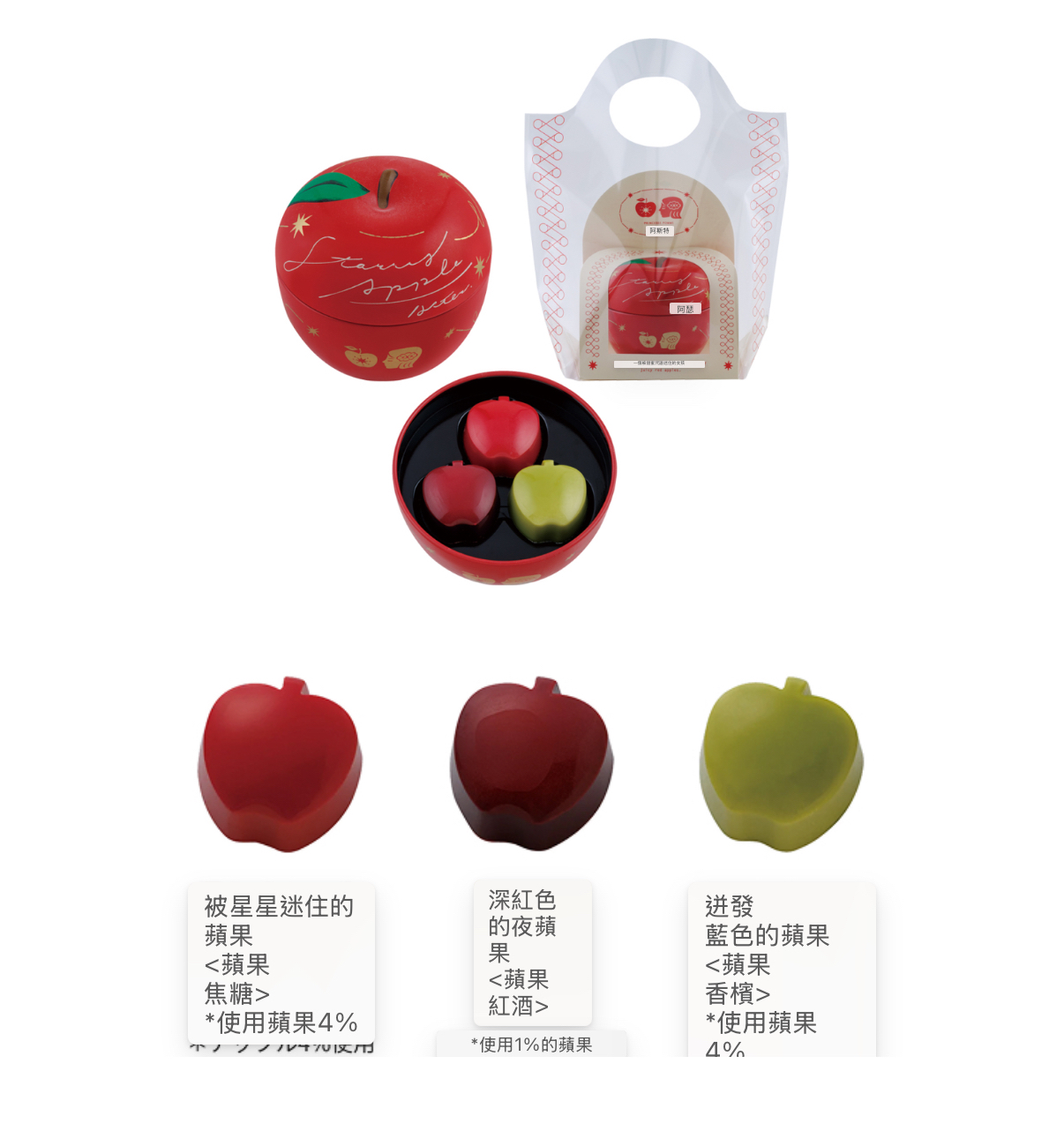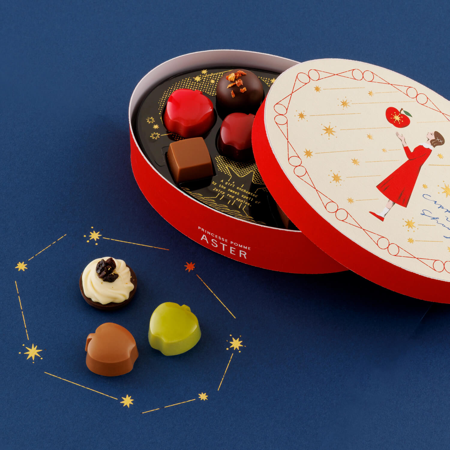 日本直送 日本 MOROZOFF X ASTER 日本最新品牌 紅色果實,甜蜜的魔法。 愛上蘋果的女孩。 出現在100年一次的星星落下的夜晚 只有一個閃閃發光的蘋果。 從咬一口的時候開始阿斯特爾的世界是, 就像被施了魔法一樣。 星星落下的夜晚的蘋果樹 流星下的蘋果樹阿斯特爾從小就 熟悉的大蘋果樹。從那裡看到的滿天的流星和 戴著星星閃閃發光的不可思議的蘋果。 被甜蜜的心動包裹著的特別夜晚的記憶。 A/星星下的蘋果樹橢圓形禮盒 顏色鮮豔的蘋果分別是帶星星的蘋果(蘋果焦糖)、深紅色的夜蘋果(蘋果酒)、琥珀色的水滴(蘋果茶)、迸發的藍色蘋果(蘋果香檳)的味道。 除此之外,還可以品嚐到甜美的心動(草莓)、閃閃發光的夜露(香檳)、星星的碎片(朗姆葡萄乾)、棕褐色的星石(特加牛奶、牛奶)的味道。 保質期 2026年4月30日 重量 140g 外觀尺寸 116mm×166mm×40mm B/可愛蘋果型朱古力小禮盒 豔麗的蘋果型巧克力分別是星星的蘋果(蘋果焦糖)、深紅色的夜蘋果(蘋果酒)、迸發的藍色蘋果(蘋果香檳)的味道。 保質期 2026年4月30日 重量 95g 大小 袋子尺寸 80mm×180mm×220mm 罐子尺寸:76mm×76mm×71mm C/獨角獸餅乾小禮盒 阿斯特爾的鉤針(黑醋餅)、花開的歌聲(桃子香檳)、蓬鬆的含羞草(橙色香檳)、溫和的洋甘菊(蘋果洋甘菊)、獨角獸的鬻(蘋果咖啡)的味道 可以享受。 保質期 2026年4月30日 重量 150g 大小 外觀尺寸 86mm×140mm×37mm E/星星的縫線禮盒 裝有書型包裝的巧克力拼盤。 刺繡中融入了阿斯特爾激動的各種事件。 圍繞著它們的是,阿斯特爾居住的星星傳到美麗的國家「星星的縫線」。 讓人聯想到滿天繁星的夜空,是阿斯特爾最喜歡的圖案。 表現了阿斯特爾的心動,披著星星的蘋果(蘋果焦糖)、人魚的眼淚(焦糖醬)、月光的絲帶(大馬爾涅)、雙胞胎的羽毛(草莓奶油)、妖精的髮飾(接骨木花) 的味道。 然後可以享受到以星星縫線為形象的巧克力(熱葡萄酒、香草酒、卡爾瓦多斯、香草、白葡萄酒的味道)。 13個裝 保質期 2026年4月30日 重量 205g 外觀尺寸 188mm×133mm×36mm F/高貴雜錦朱古力禮盒 上層放著阿斯特爾編織的鉤針裝飾(牛奶、白、黑醋酸)和表現了阿斯特爾國家流傳的「星星縫線」的巧克力(熱葡萄酒、卡爾瓦多斯、香草、白)。 在下層,將星星的蘋果(蘋果焦糖)和妖精的髮飾(接骨木花)、溫和的洋甘菊(蘋果洋甘菊)等味道組合在一起。 16個裝(2層裝) 保質期 2026年4月30日 重量 335g 大小 外觀尺寸 105mm×160mm×68mm 📆12/1截12pm 📆5/2到 💰批 A 💰102 💰10以上97 B 💰 74 💰10以上69 C 💰85 💰10以上80 D 💰142 💰10以上137 E 💰200 💰10以上195