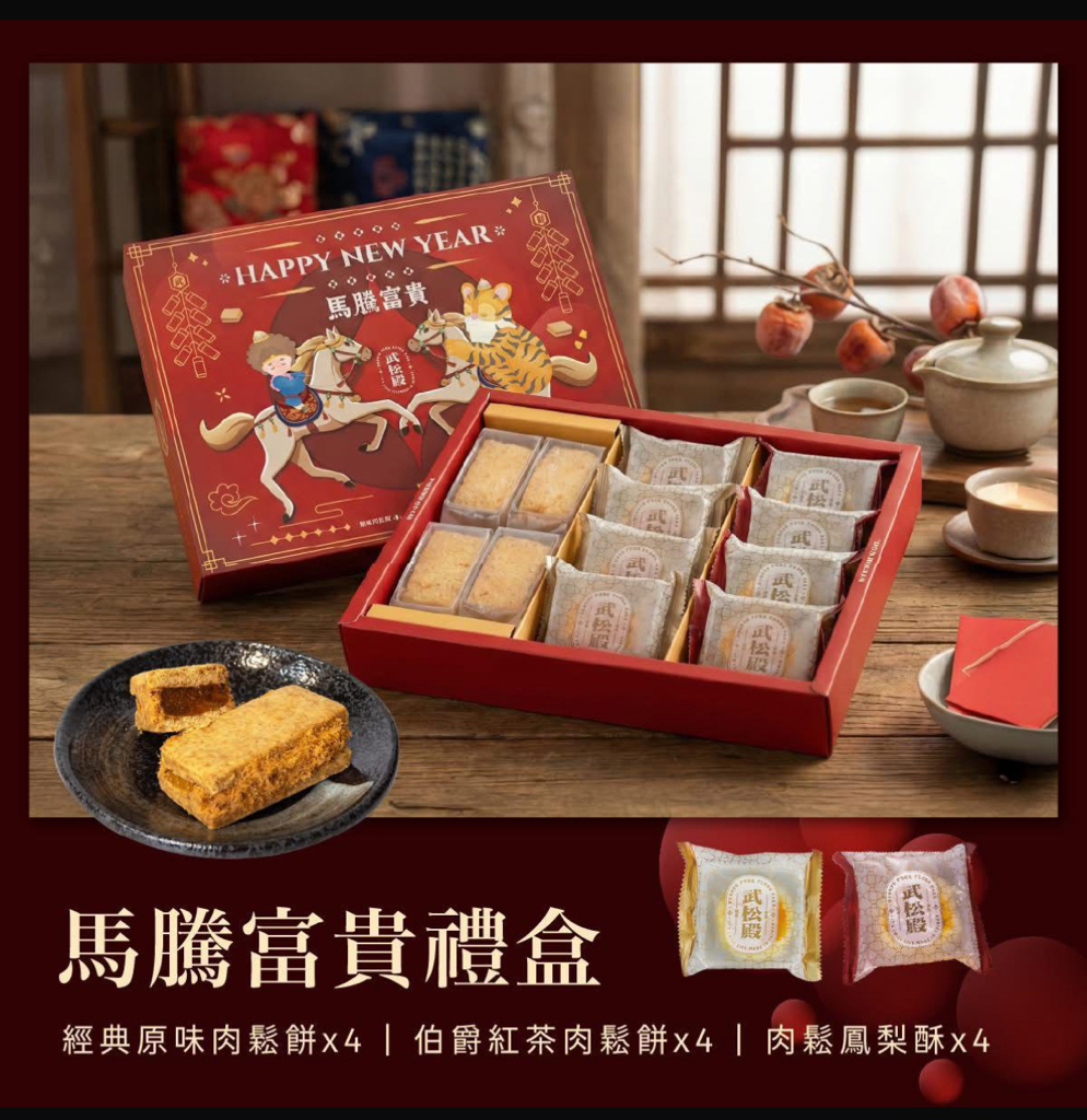 武松殿 2026 新年禮盒 ✦ 用殿堂級的美味 幫你傳遞心意 ✧ 新穎的設計和精緻創新的產品 將滿載的心意用特別的禮盒送給重要的人 👍 台灣肉鬆餅首選品牌 👍 皮1肉鬆9,堅持手工捏製 👍 薄脆餅皮富層次,涮嘴停不下 👍 HACCP與ISO認證烘培廠製作 - 🧨 2026限定新春禮盒 🧨 【馬騰富貴】 新春送禮推薦-肉鬆鳳梨酥! 象徵旺來的鳳梨和代表台灣的肉鬆 酸甜中帶點鹹,驚喜滿分! • 經典原味肉鬆餅4顆 • 伯爵紅茶肉鬆餅4顆 • 肉鬆鳳梨酥4顆 【福馬呈祥】 首推新品-沙茶肉鬆餅! 全新演繹舌尖上的國民美味 將台灣在地美食代表「沙茶」 融入傳統糕餅中,獨一無二的風味 • 經典原味肉鬆餅6顆 • 沙茶肉鬆餅6顆 武松殿-新春禮盒 福馬呈祥(60天) 內容:原味肉鬆餅*6、沙茶肉鬆餅*6 12粒裝 (一箱10盒) (國際條碼:4710588261583) 批 HK$180/盒 建議零售價 Hk$258/盒 武松殿-新春禮盒 馬騰富貴(40天) 內容:原味肉鬆餅*4、伯爵紅茶肉鬆餅*4 肉鬆鳳梨酥*4 12粒裝 (一箱10盒) 📦箱批 $190 散批$195 建議零售價 Hk$278/盒 武松殿-經典原味肉鬆餅(60天) 10粒裝 (一箱20盒) 📦箱批 $205 ⭕️散批$210 建議零售價 Hk$198/盒