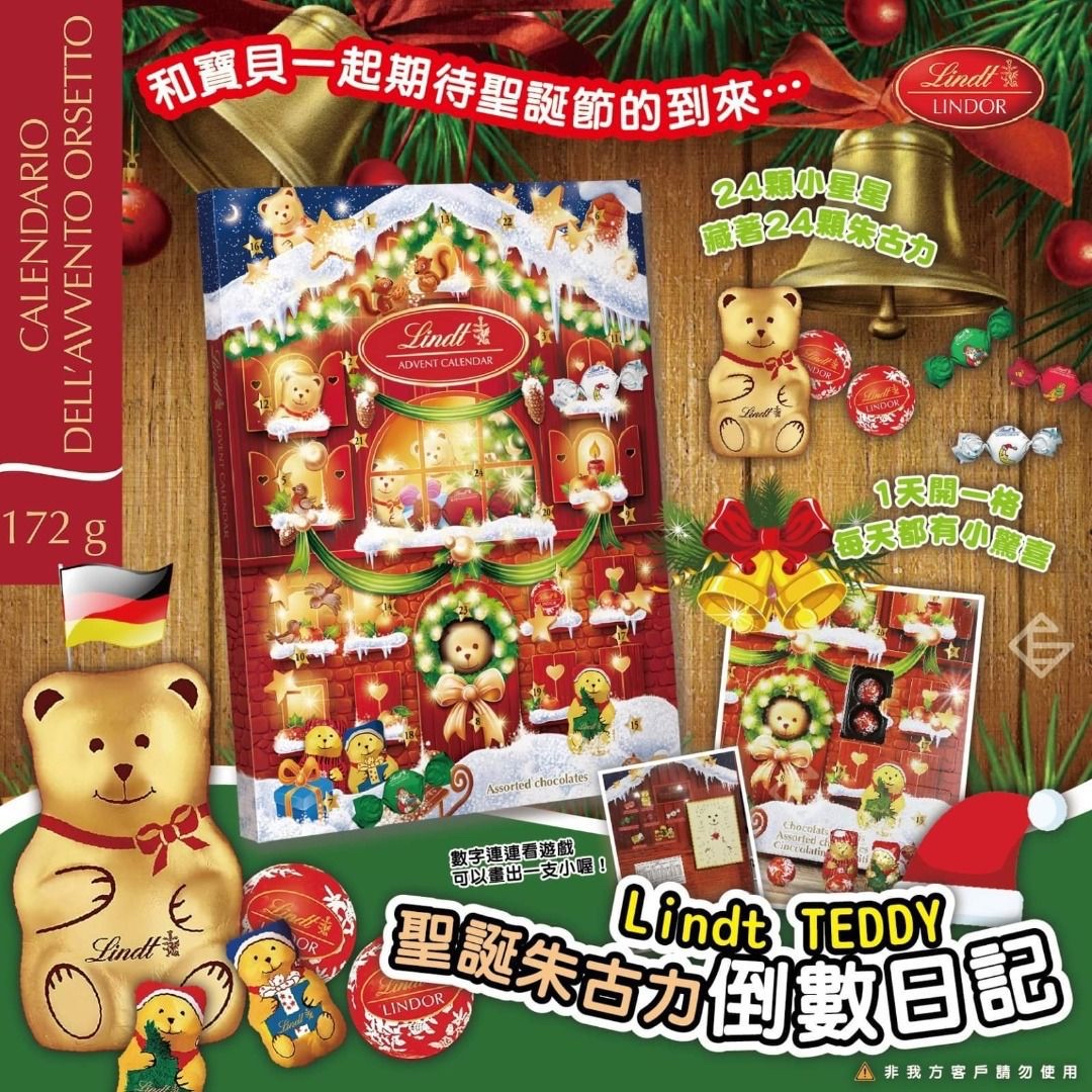 瑞士蓮2025年新款聖誕日曆朱古力禮盒170g, EXP:2026/03/31 來自瑞士的百年朱古力品牌,每個小窗戶後都藏著一粒不同形狀的朱古力 小熊,愛心,星星,每款都是聖誕節日限定造型 濃郁的牛奶朱古力,絲滑的榛子夾心朱古力,充滿聖誕的浪漫和美好。從聖誕月12月1日開始,28粒朱古力,讓幸福每日陪著您。一起感受聖誕月的幸福甜蜜吧! 截單日:11月16日 到貨日期11月29-30日