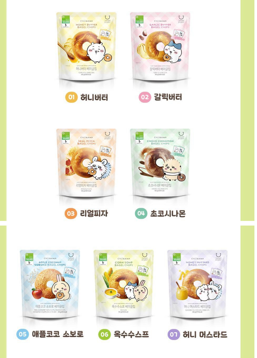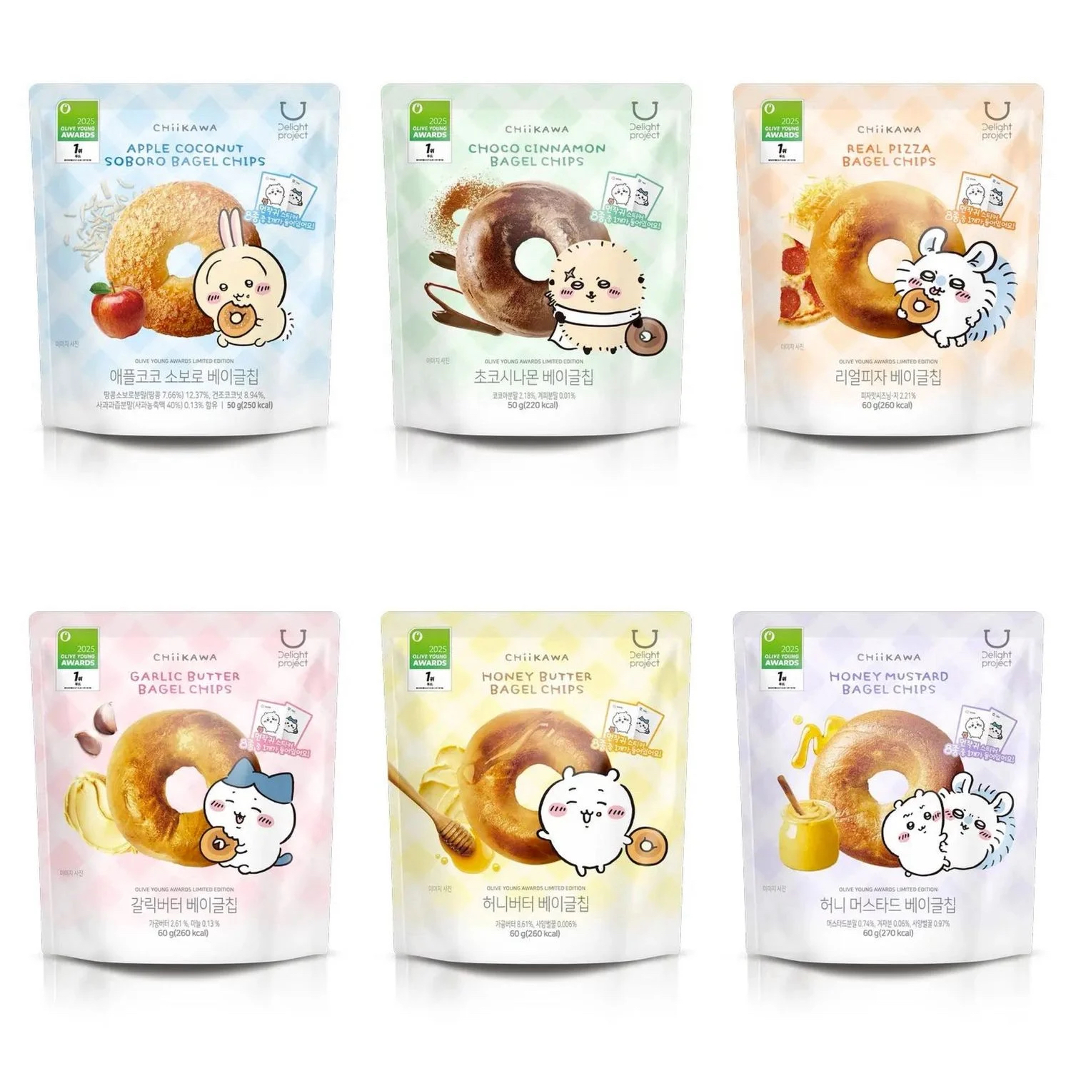 韓國直送 Chiikawa] Delight Project Bagel Chip 低卡貝果片 (random Sticker) 1套5包(每個味各1包)口味隨機 🔗歡迎網站落單 韓國「Olive Young X 吉伊卡哇」聯名!推出6款限定口味包裝,每包隨附角色貼紙心】 逛韓國 Olive Young,除了必買各種美妝,/其自有品牌推出的零食餅乾也是熱門選項,其中「貝果餅乾」更是蟬連多次熱賣排行榜冠軍想到這回居然與《吉伊卡哇》聯名,吉友真的要買爆! 沒 這系列聯名共推出6款限定包裝,口味包含:蜂蜜奶油、大蒜奶油、蜂蜜芥末、Real Pizza、、蘋果椰子、巧克力肉桂C人氣角色吉伊卡哇、小八、兔兔、小桃與海獺師傅現身包裝上,超級可愛!且每包聯名餅乾皆附有一張吉伊卡哇隨機貼紙,共有8款 吉伊卡哇版貝果片將於11/30起於韓國Olive Young限定上市除了享用美味的餅乾,還能收藏可愛貼紙(◎最近有去韓國的吉友必買!當作伴手禮也很適合呀~ 圖片來源:Olive Young 📆20/12 中午12點 📆預計1月中𢓭到 💰$79 💰10以上$75