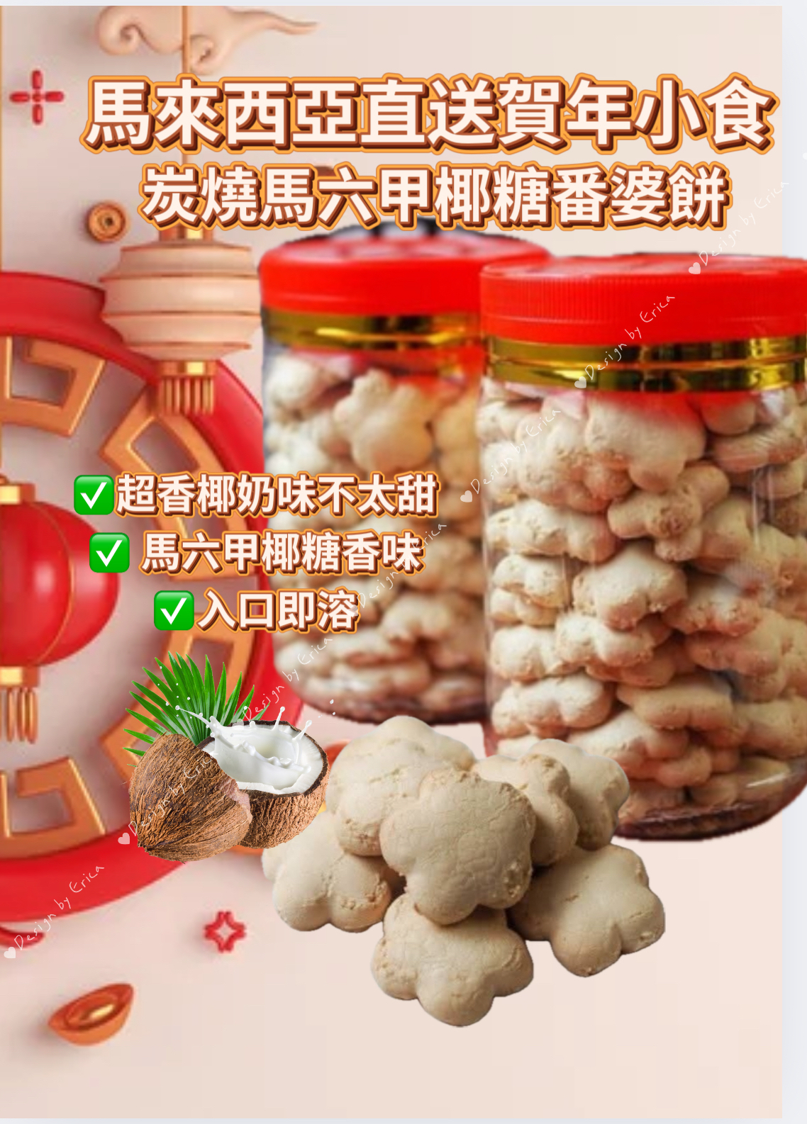 馬來西亞直送馬來西亞賀年小食 K馬來西亞🇲🇾新年團🧧 每年都爆單的年餅之一 ❤️ #炭燒馬六甲椰糖番婆餅 #炭燒原味番婆餅 🌸 大力推薦這款花花造型的番婆餅😍 椰香味特濃但不太甜‼️ 一開蓋聞到馬六甲椰糖的香味🤤🤤 採用有雞蛋沙谷粉 入口即化 👍 吃在嘴裡滿滿的馬六甲椰糖香味❤️ 絕對讓你吃了就停不下來🫣 📦1箱24入 💰箱出$68 💰散出$63 📅10/1截 📆25/1前到