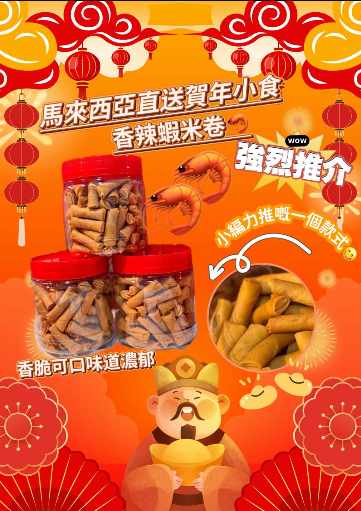 馬來西亞直送馬來西亞賀年小食 D/香辣蝦米卷 喜歡吃微辣又香脆小吃的你、一定要試試這香辣蝦米卷😍 一口咬下去那個脆口的聲音 再加上中間的濃郁蝦米味、那個口感真的好吃的不得了 😋 它絕對是你一定會愛上的小零嘴之一 👍🏼 🔗歡迎網站落單 ✅一罐320g+- ✅️一套1罐 📦1箱24入 💰箱出$45(可混) 💰散出$50 📆10/1截 📅25/1前到