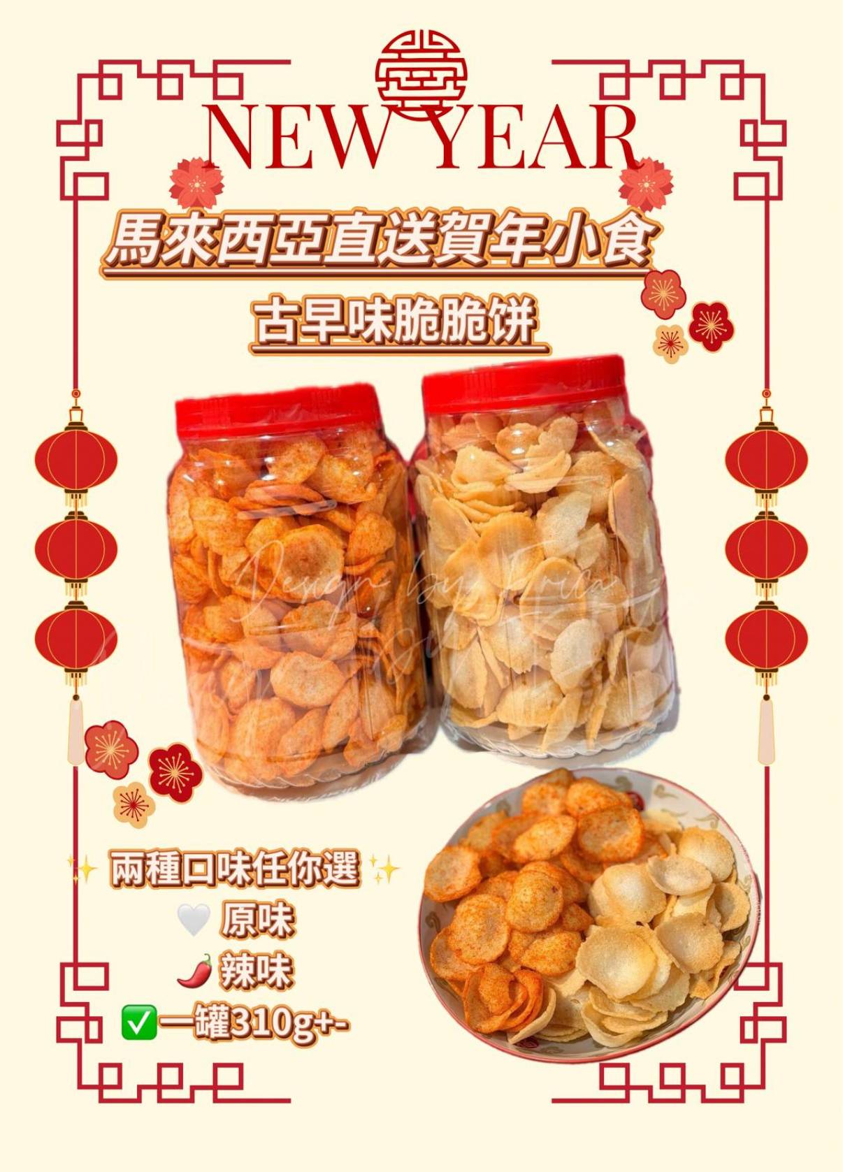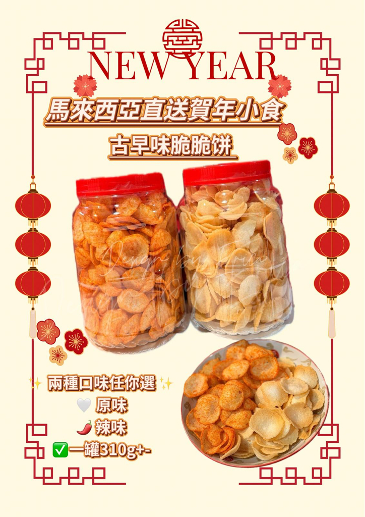 馬來西亞直送馬來西亞賀年小食 L🧧 古早味脆脆餅 一口就知道,是小時候那種對的味道😋 薄薄一片,咬下去直接 咔嚓脆 💥 不油、不膩,越吃越順口,真的會忍不住一直拿🥰 不花俏、不複雜,就是那種一開罐就會默默吃掉一半的脆脆餅😎✨ 🫙追劇配它 🫙聊天配它🫙想吃點脆的,也是它就對了😋 ✨ 兩種口味任你選 ✨ L1🤍 原味 L2🌶️ 辣味 ✅一罐310g+- 📦1箱12入 💰箱出$58 💰散出$63 📆10/1截 📅25/1前到