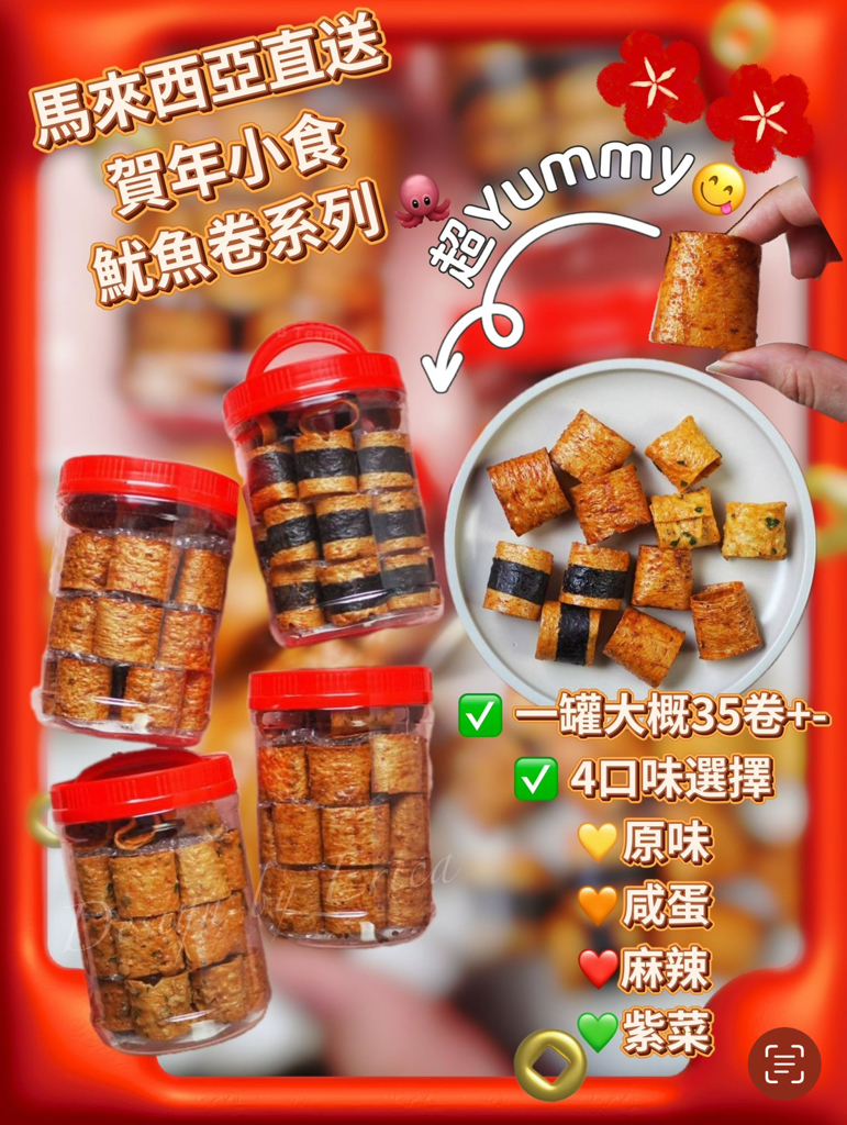 馬來西亞直送 馬來西亞賀年小食 A/魷魚卷系列 🐙 魷魚卷肯定是每年新年大家都愛的年餅之一✌️不用我多說、買過的都知道我們家的魷魚卷多好吃 😋 每年都賣到斷貨的‼️識貨的你就要提早噸貨 😎 現在也可以買回去解饞先呢 🤭 ✅ 一罐大概35卷+- ✅ 4口味選擇 A1💛原味 A2🧡咸蛋 A3❤️麻辣 A4💚紫菜 📦1箱12入 💰箱出$50(可混) 💰散出$55 ⭕️四個口味每樣只有兩箱出完就冇