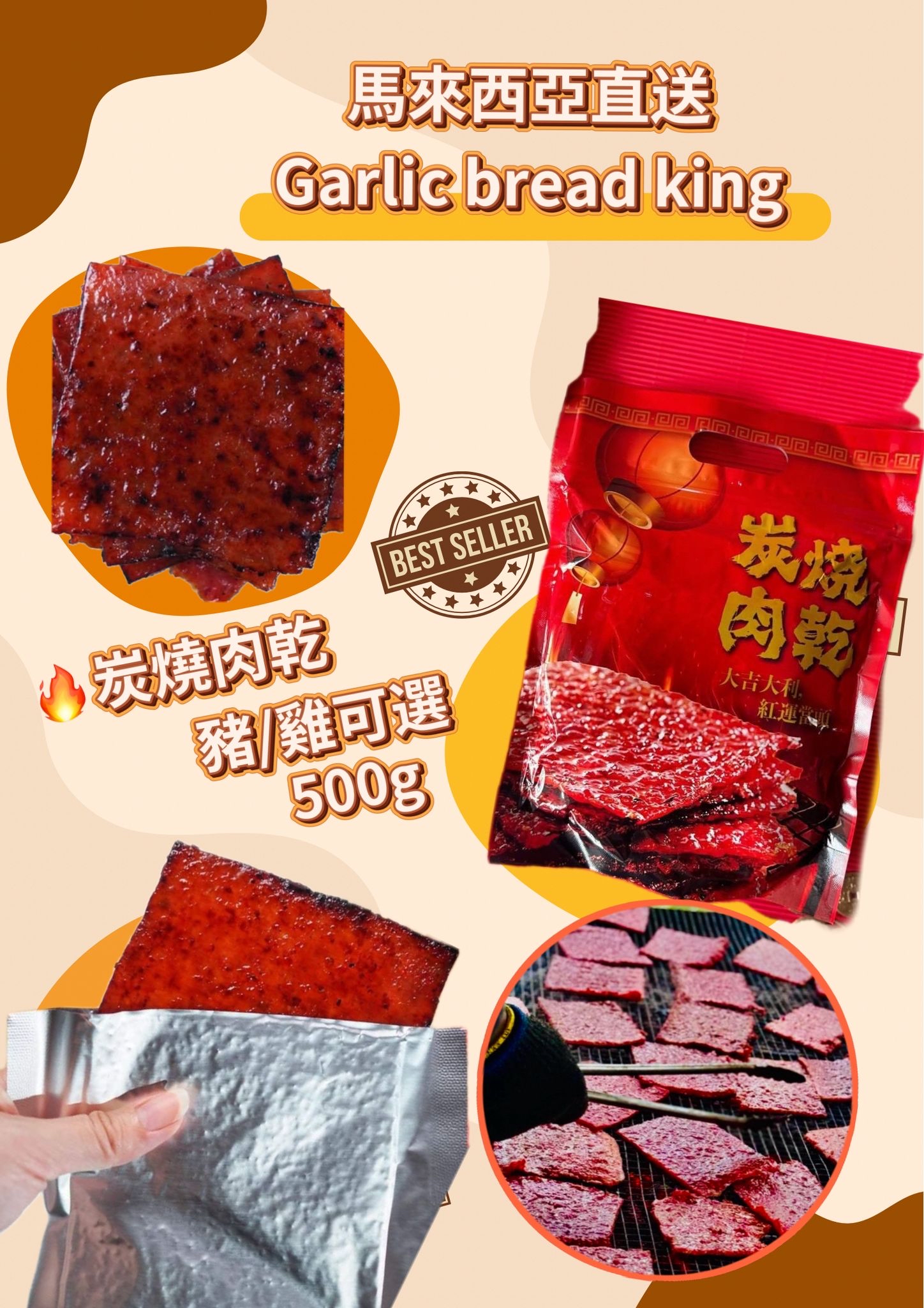 馬來西亞直送 Garlic bread king 🔥炭燒肉乾 📣豬/雞可選 今次為大家介紹另一款馬來西亞炭燒肉乾 亦都喺馬來西亞幾十年嘅老字號,即叫即燒保持新鮮!每一塊都有炭燒嘅香味👍🏻 想吃就吃,誰規定要等過年?! 😏 每一口都是 濃郁炭香+鮮嫩肉感,越嚼越香,欲罷不能🤤 🍞 夾進麵包,加點肉絲,直接 昇華成神級美食😋 ☕ 下午茶配上幾片,爽到飛起😋 嘴饞時隨手抓一片,幸福值瞬間爆表💯 ✅一包500g+ 一包大約有7至9片全部大大片視乎厚薄而定 💁♀️拿回去煎/烤一下搭配肉乾 也是嘎嘎好吃😋 📆保存日期常溫一個月 亦都可以選擇放喺雪櫃可以存放三個月 📆24/12 截 📆1月中後到 💰$70 💰20以上$65