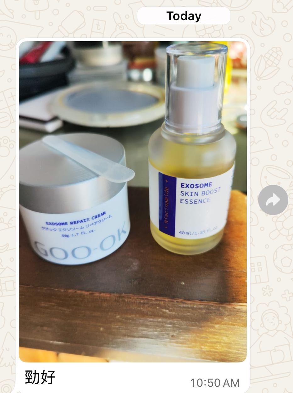 💠外泌體技術 + 獨家勝肽複合物💠 GOO-OK 外泌體修護面霜結合植物外泌體與 PerfectBiome 獨家勝肽複合物,能深層修復受損肌膚,保持水分,抗氧化,並改善膚色與彈性。這款面霜適合所有膚質,能有效減少細紋、提升光滑度,讓肌膚重現明亮健康的光澤。 主要功效 : ✅深層保濕 有助於保持皮膚水分,防止乾燥,讓肌膚長時間保持水潤。 ✅抗氧化與修復 外泌體技術能抗氧化、保護皮膚,並修復受損肌膚。 ✅改善膚色 促進明亮健康膚色,減少斑點,讓肌膚更均勻透亮。 ✅提升彈性與光滑度 增強皮膚彈性,改善細紋,讓肌膚更緊緻光滑。 ➡️核心成分 - 植物外泌體 從植物發芽到智能農場生產,經過嚴格品質控制,最大化植物生成分的益處。 含有細胞間訊號傳導所需的蛋白質、核酸、脂質和代謝物,能促進細胞修復與再生。 - Derma PEP RP™️ PerfectBiome 獨家技術開發的皮膚再生勝肽複合物,修復和恢復受損皮膚的活力。 - Derma PEP AR™️ PerfectBiome 獨家技術開發的皮膚改善皺紋勝肽複合物,增強皮膚彈性和光滑度。 - Derma PEP WH™️ PerfectBiome 獨家技術開發的皮膚美白勝肽複合物,減少斑點,實現更明亮、均勻的膚色。 - 植物愈傷組織提取物 提供皮膚再生和彈性提升所需的營養,最大化修復與抗衰老效果。