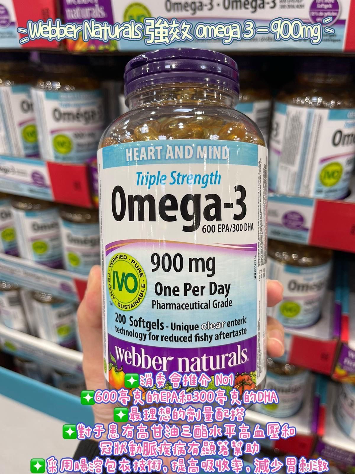 Webber Naturals 900 mg 強效魚油 ❇️200 粒 ❇️Omega-3脂肪酸可以顯著降低心臟疾病的風險,降低血液甘油三酯水平,並具有抗炎特性。ω-3脂肪酸EPA和DHA是整個身體,是身體和心理健康的關鍵。 ❇️600毫克的EPA和300毫克的DHA。該劑量對于患有有高甘油三酯水平,高血壓和冠狀動脈疾病的人來說就最理想 ❇️改善認知功能,情緒,並減少抑郁症的症狀 ❇️減少炎症如類風濕關節炎和炎症性腸病 ❇️采用腸溶包衣技術,提高吸收率,減少胃刺激。 Bb 2029 Apr