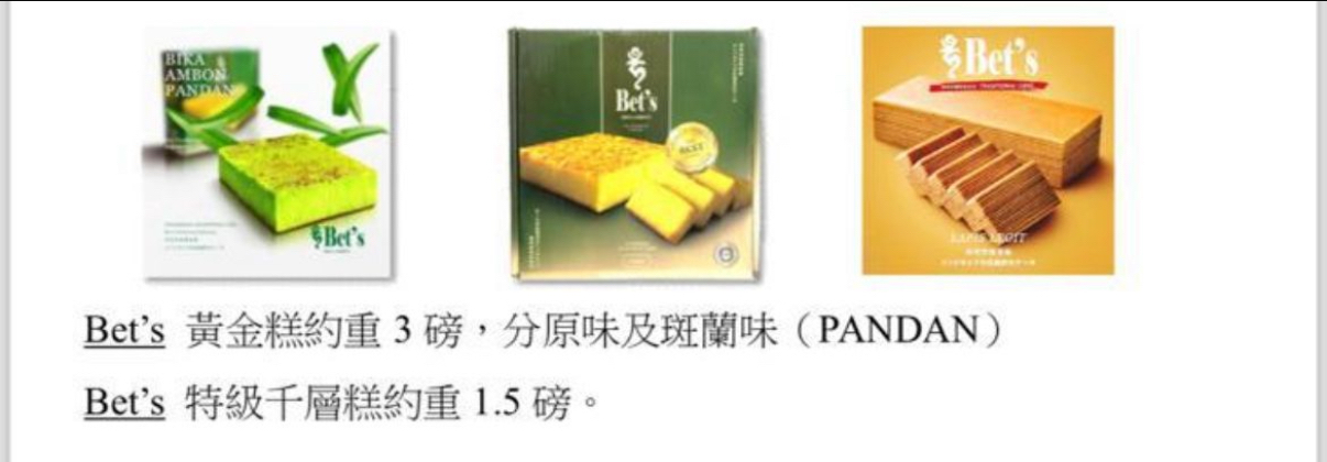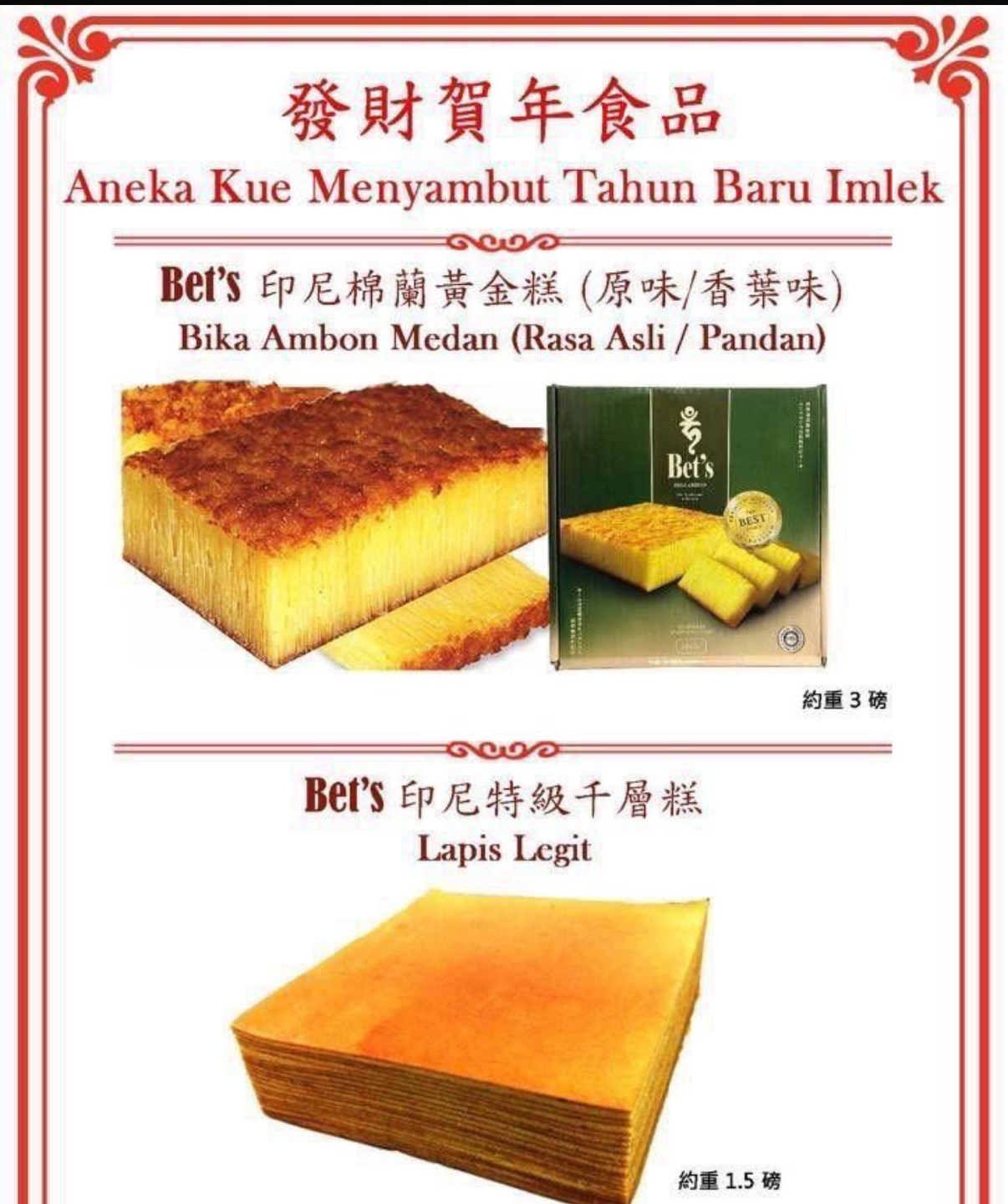 印尼🇮🇩直送 Bet’s黃金糕 再度回歸連續四年繼續收單 印尼直送 1/經典原味黃金糕 2/斑斕口味3磅裝(綠色包裝盒) 3/千層糕(紅色包裝盒) 每年新年最期待嘅就係呢一款! 都荼毒到唔少客人朋友😆😆😆 每年新年都喪食!完全忍唔到口!🤤🤤 無一隻HK嘅可以匹敵! 📆27/1截 12點截 📆✈️11/2到香港 📆0-4度可以存放10天 📆恆溫存放7天 🔺黃金糕1箱10個 🔺千層糕1箱20個 ⭕️今年印尼加咗價 🟥準時截單不設加單大家留意到貨日期因為食用期比較短,‼️‼️千祈唔好吹單‼️‼️‼️ 因為統一到貨日期我亦都控制唔到個到貨日期如果比較心急嘅客人請考慮清楚才下單謝謝🙏🏻 💰已入數為準🙏🏻 📦黃金糕一箱10盒 箱出$258 散出$263 📦千層糕一箱20盒 箱出$258 散出$263