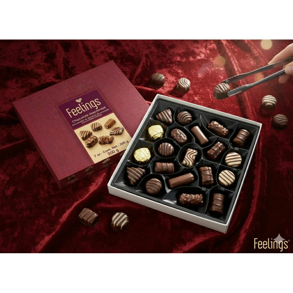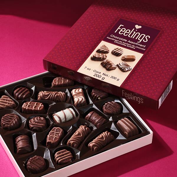 德國Feeling什錦裝 200克 雜錦朱古力禮盒包含 20 塊 10 種不同口味的巧克力,包括杏仁、覆盆子、焦糖、咖啡、椰子和橙子口味。 呢款朱古力多款口味仲要來自德國,德國嘅朱古力🍫大家都知道有幾好食,呢個款式亦都性價比高一盒裏面有10款口味可以俾大家試埋唔同嘅口感豐盛嘅體驗😆😆 絕對適合一家大細送禮自用非常合適 📆食用日期07/2026 📆現貨on the way 💰$58 💰10以上$53