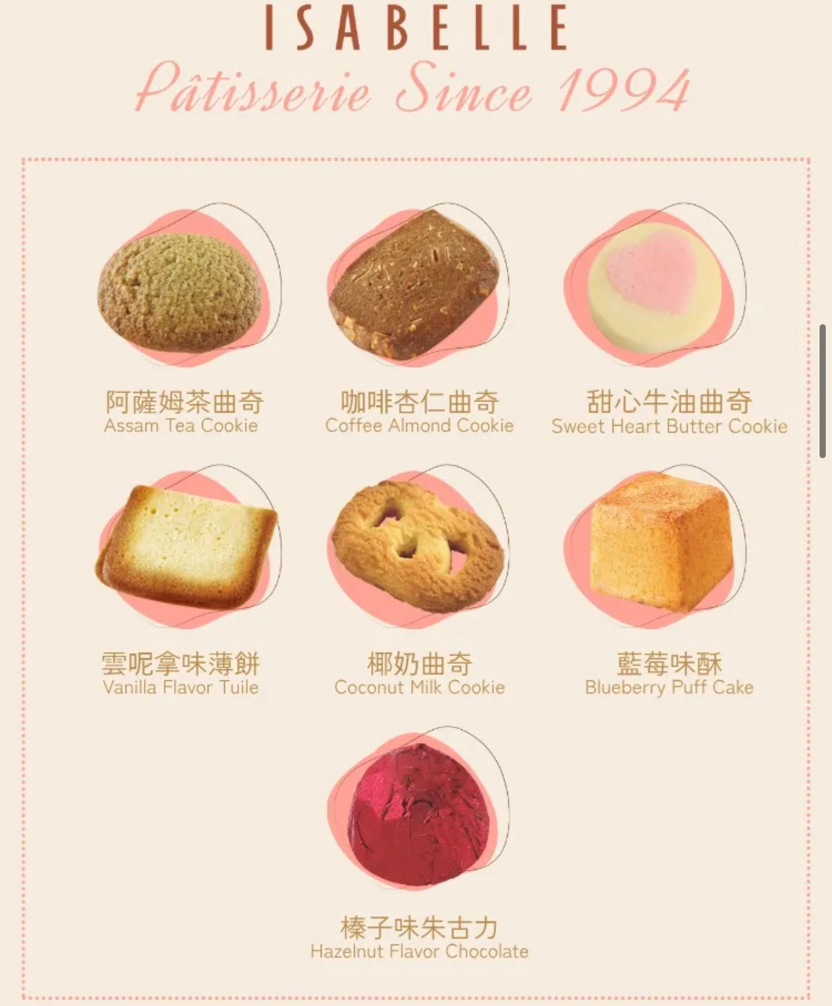 上層: 阿薩姆茶曲奇 x 5, 咖啡杏仁曲奇 x 4, 甜心牛油曲奇 x 6, 雲呢拿味薄餅 x 6, 椰奶曲奇 x 3, 藍莓味酥 x 2, 榛子味朱古力 x 1