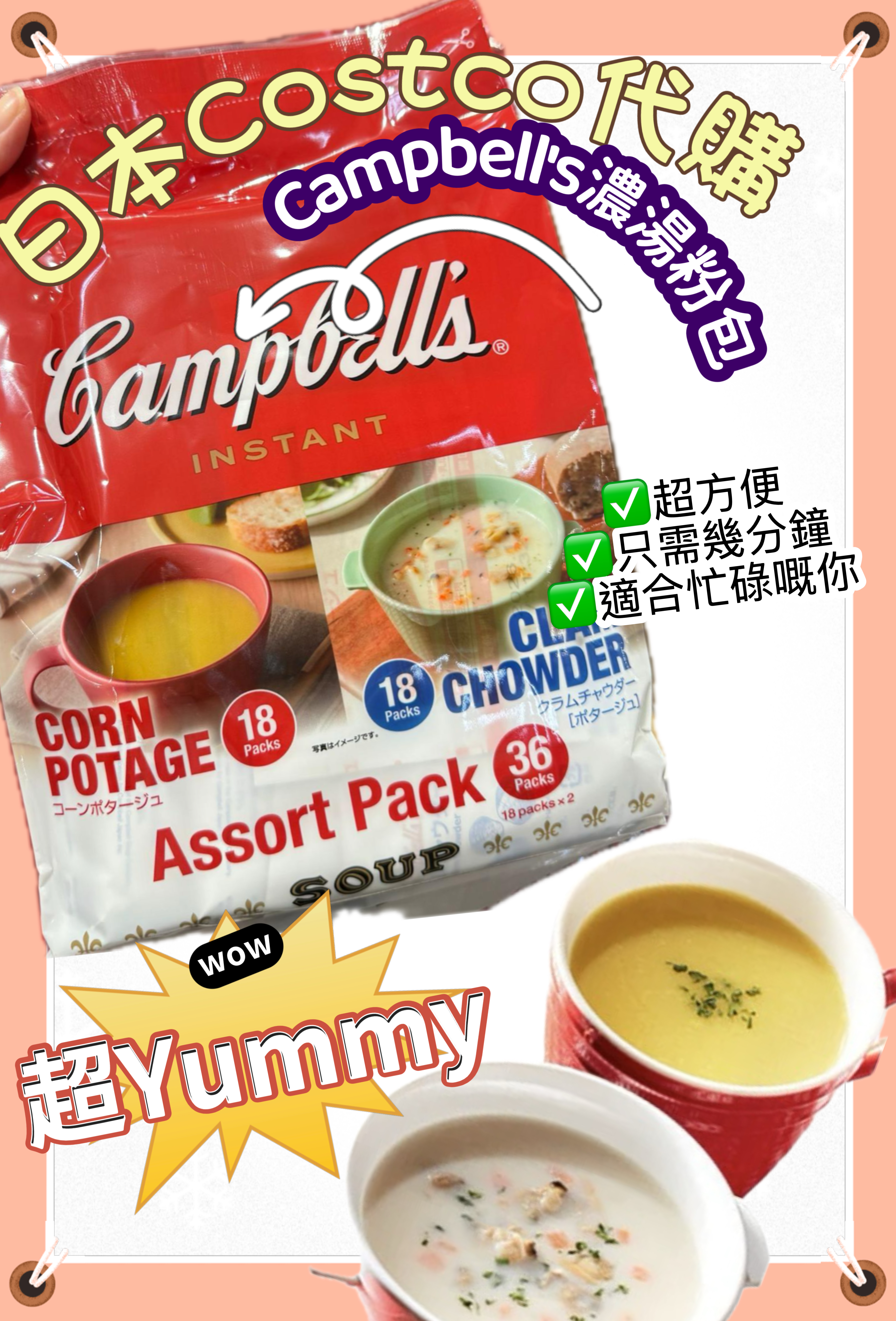 日本Costco代購 📣Campbell's濃湯粉包 ✨這些濃湯粉包方便攜帶且準備快速,只需幾個步驟,就能享受到濃郁的湯品。 ✨蜆湯帶來奶香和蜆的鮮味,而粟米濃湯則融合了粟米的甜美和奶油的細膩口感,為忙碌的生活增添美味。 非常方便生活節奏急促嘅香港人無論你係宵夜早餐或者下午茶都非常方便,只需幾分鐘你就可以享受到😋 ▸ 周打蜆湯: 這款周打蜆湯以牛奶和貝類的鮮美結合,帶來濃厚的正宗風味。 ▸ 粟米濃湯: 使用甜粟米,香氣撲鼻,口感醇厚,令人難以抗拒。 ▸ 簡單方便: 只需加入熱水,輕鬆享受美味湯品,適合忙碌的生活方式。 ▸ 經濟實惠: 包含18袋周打蜆湯和18袋粟米濃湯,共36食的超值組合。 🔷款式:36入(蜆濃湯18入+粟米濃湯18入) 🔷產地:日本 Japan 🔷賞味期限:11/2026 📆5/1截 📆20/1左右到 💰批$155 💰10以上$150